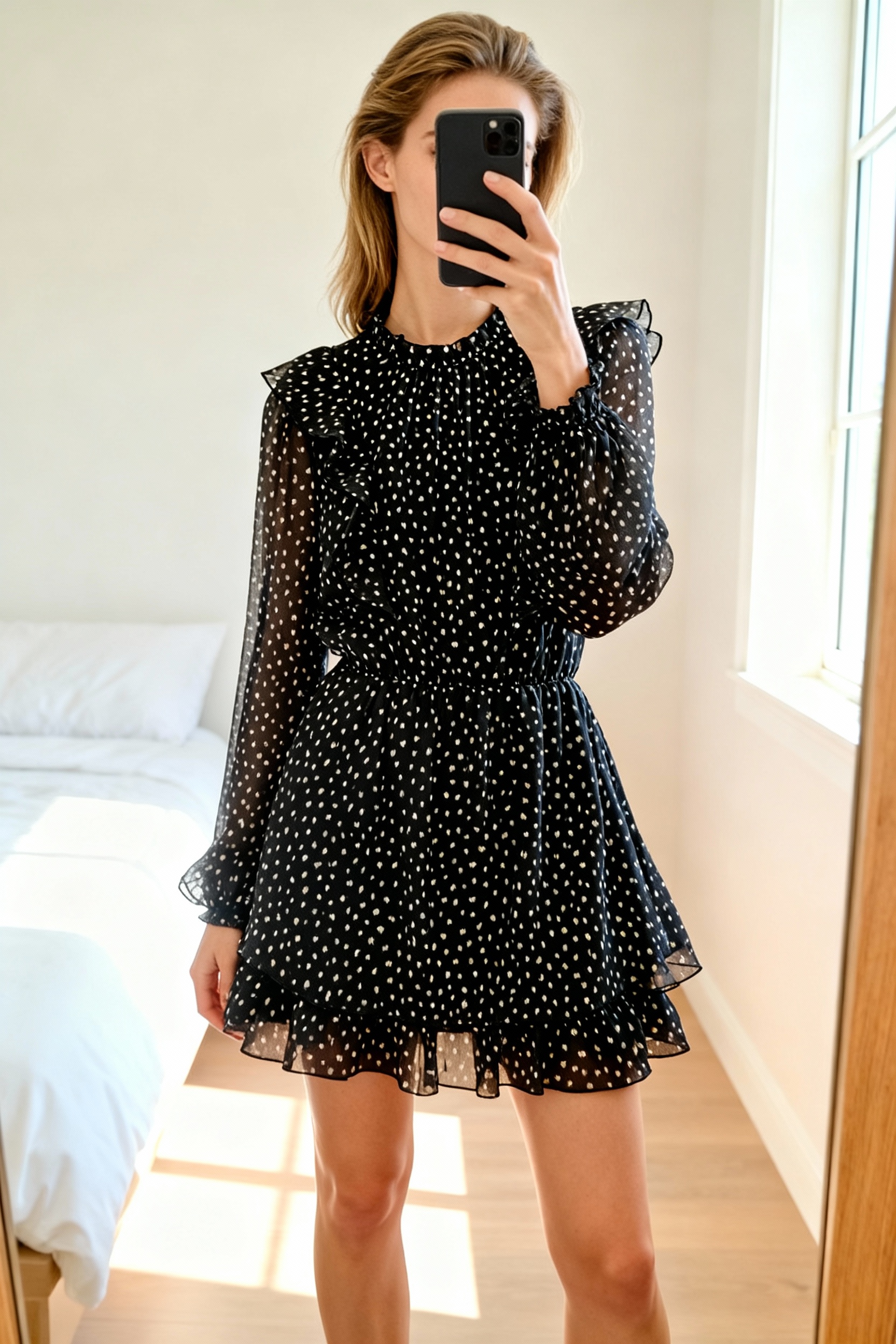 Robe Zara à pois debout, face à la caméra, dans une chambre à la lumière douce, avec une lumière naturelle filtrant par la fenêtre.