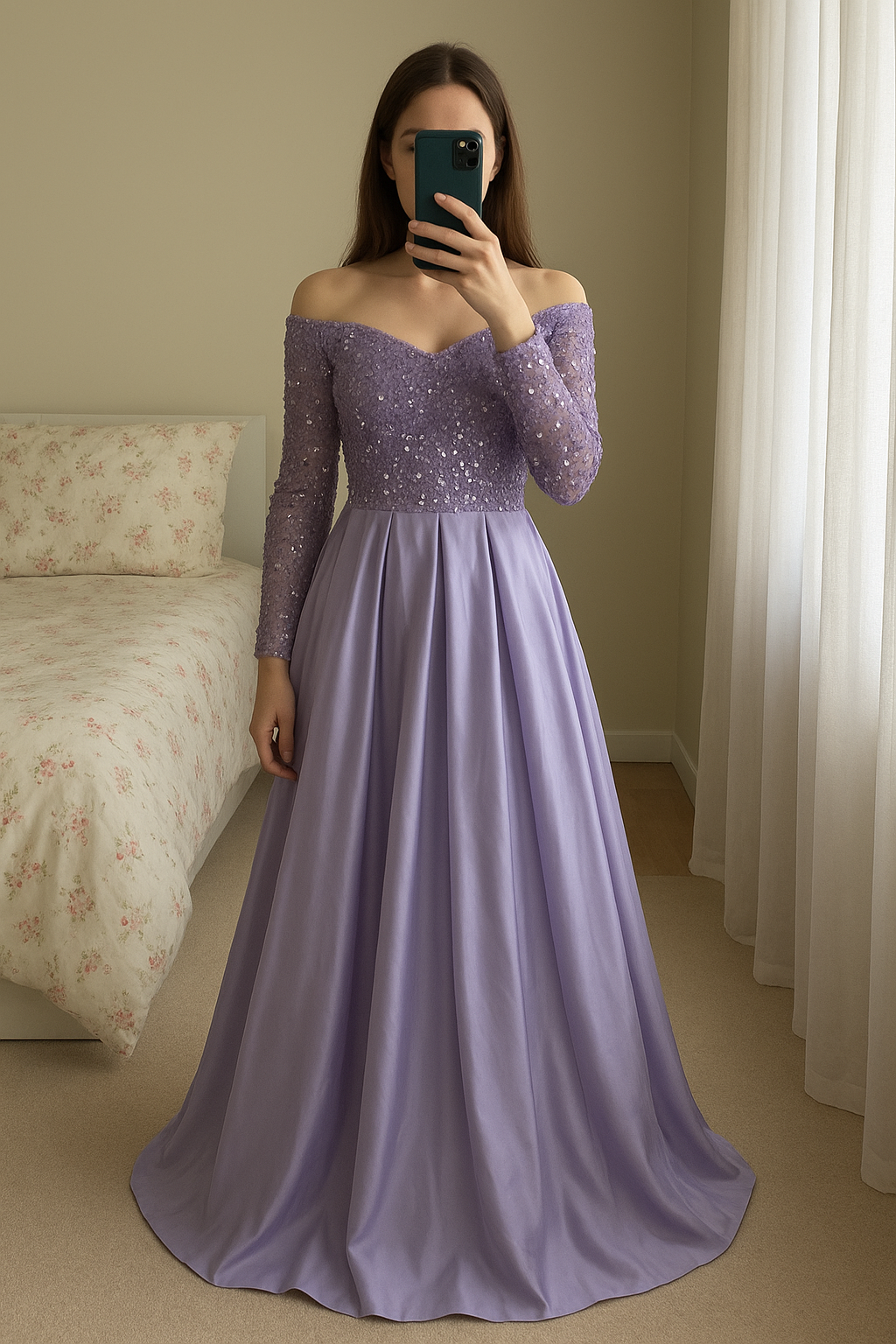 Robes soirées debout, face à la caméra, dans une chambre à la lumière douce, avec une lumière naturelle filtrant par la fenêtre.