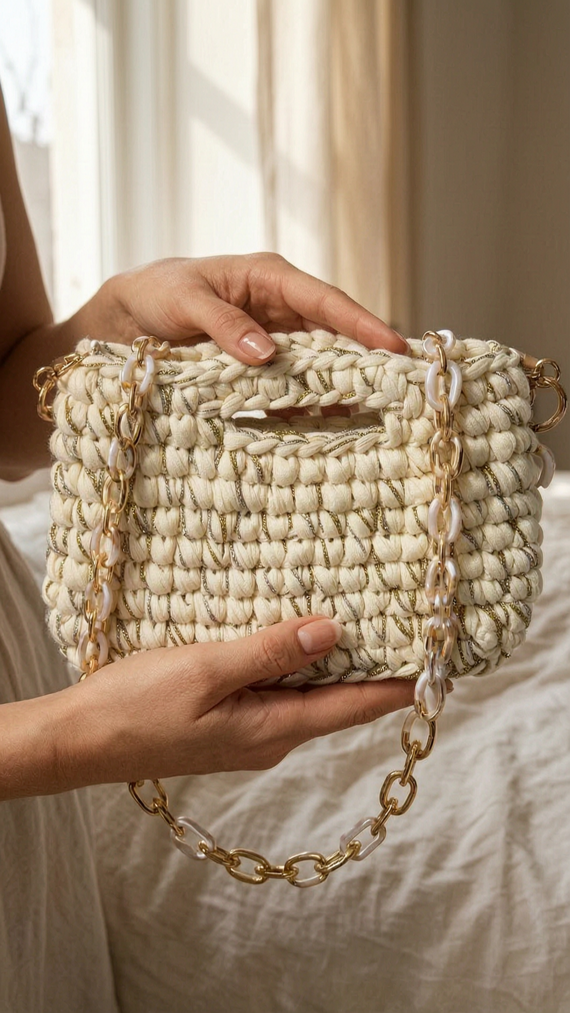 Sac crochet fait main debout, face à la caméra, dans une chambre à la lumière douce, avec une lumière naturelle filtrant par la fenêtre.