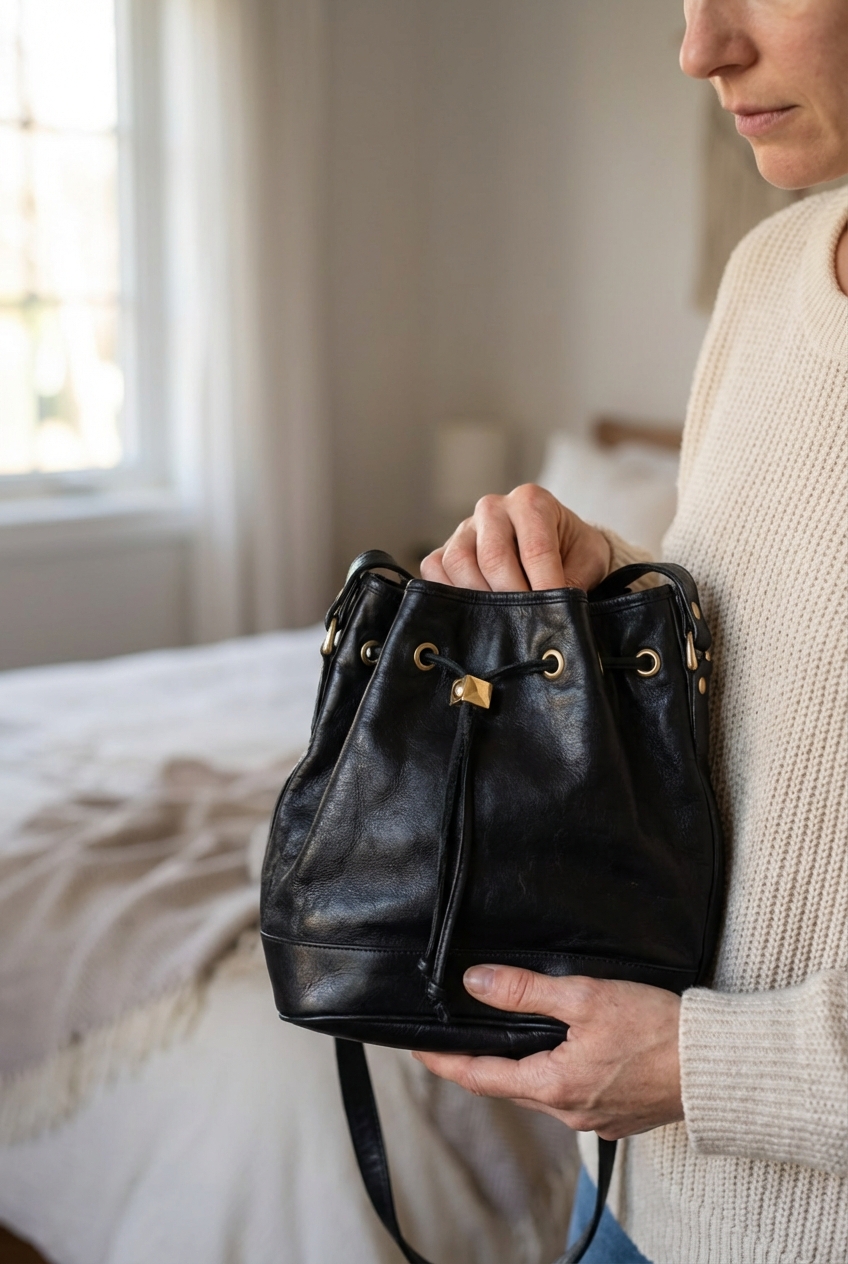 Une personne en Sac à main bandoulière Bally debout, face à la caméra, dans une chambre à la lumière douce, avec une lumière naturelle filtrant par la fenêtre.