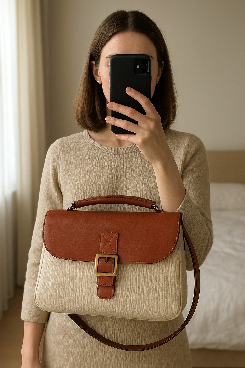 Sac à main bandoulière porté épaule TEXIER cartable vintage cuir + toile debout, face à la caméra, dans une chambre à la lumière douce, avec une lumière naturelle filtrant par la fenêtre.