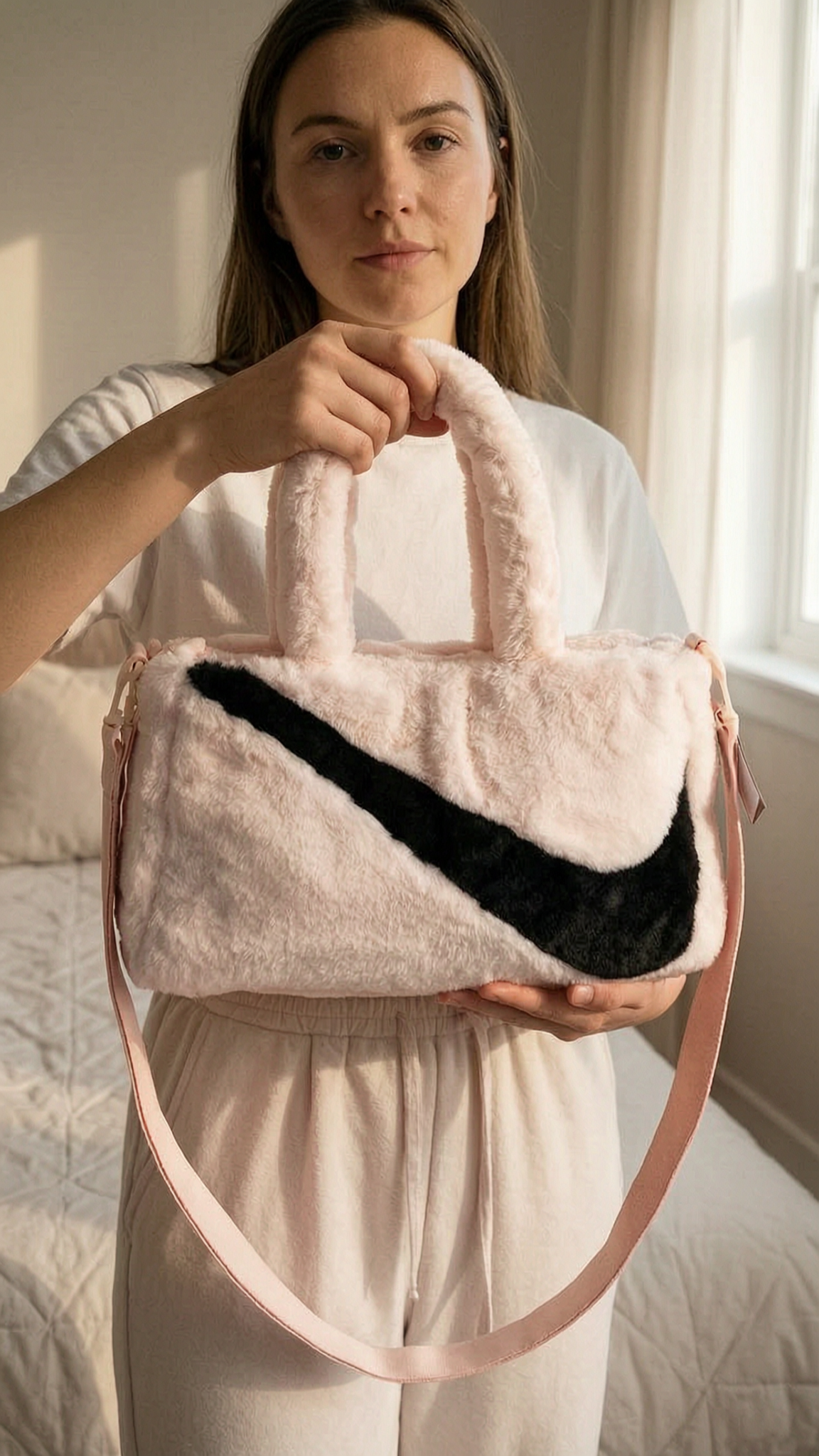 Sac à main Nike neuf debout, face à la caméra, dans une chambre à la lumière douce, avec une lumière naturelle filtrant par la fenêtre.