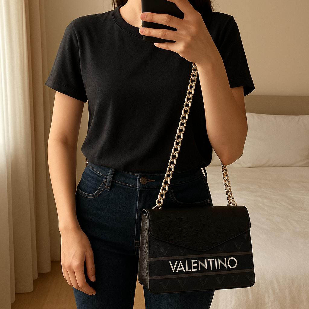 Sac à main Valentino debout, face à la caméra, dans une chambre à la lumière douce, avec une lumière naturelle filtrant par la fenêtre.