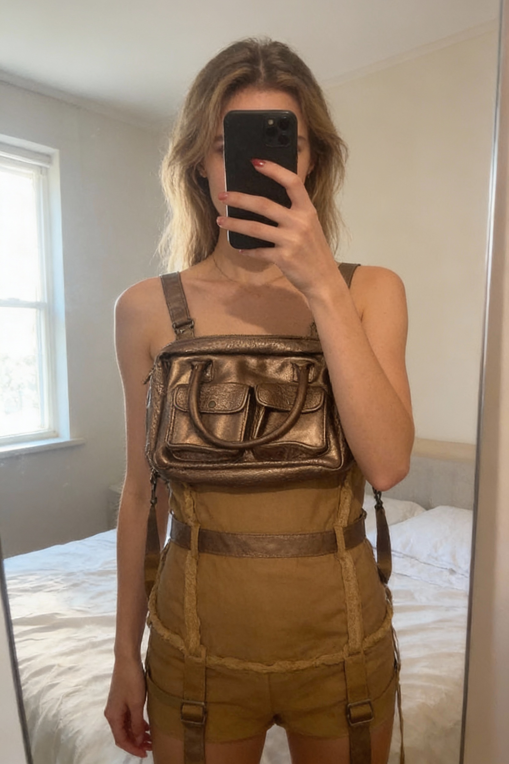 Sac Paul Marius debout, face à la caméra, dans une chambre à la lumière douce, avec une lumière naturelle filtrant par la fenêtre.