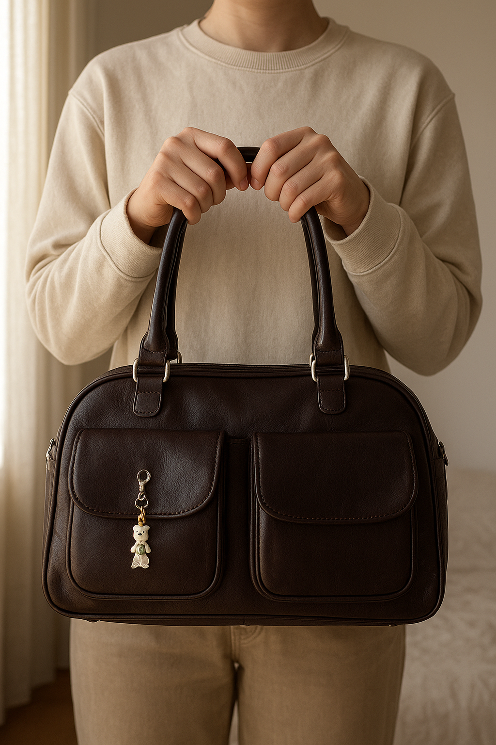Sac vintage marron bordeaux debout, face à la caméra, dans une chambre à la lumière douce, avec une lumière naturelle filtrant par la fenêtre.