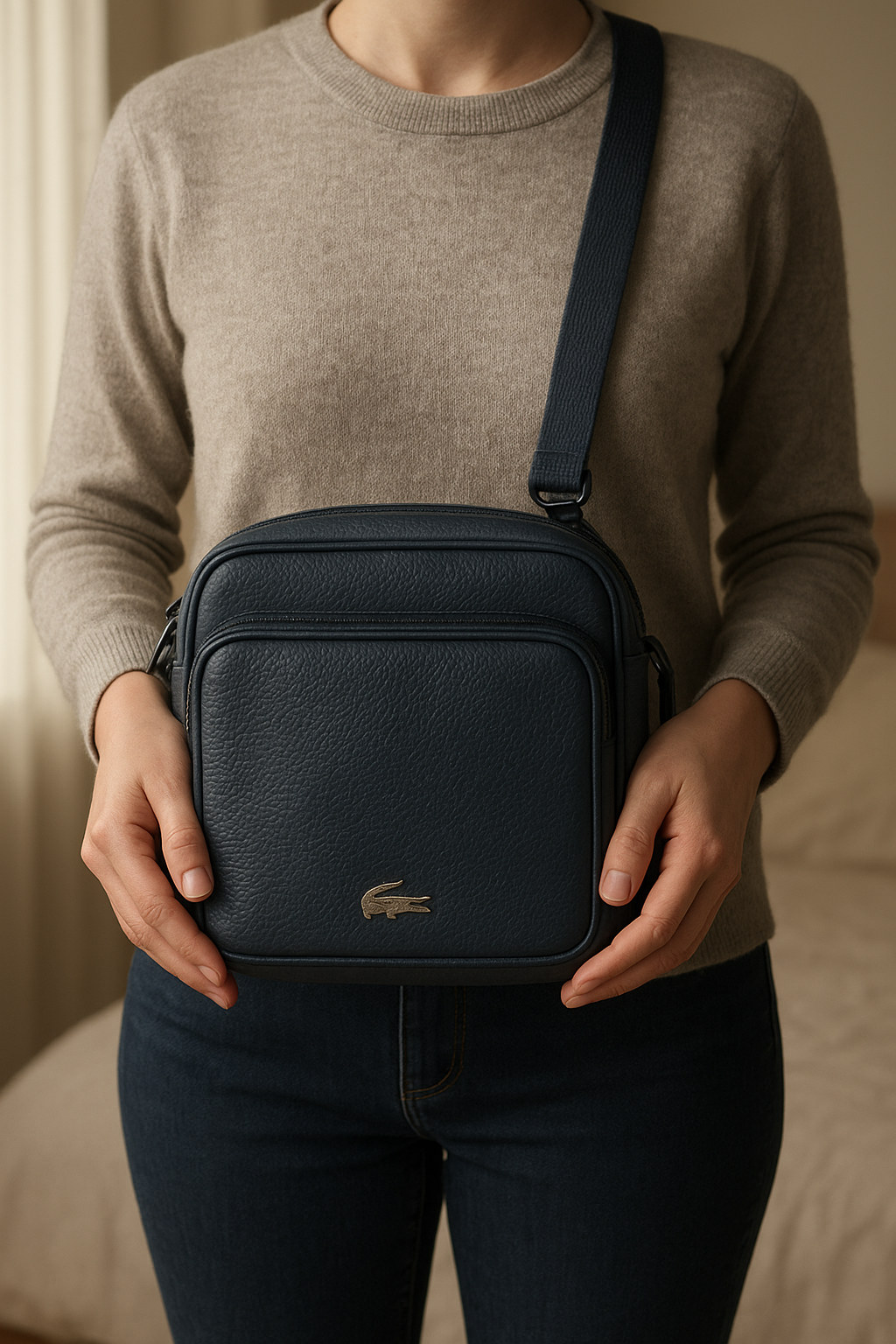 Sacoche Lacoste debout, face à la caméra, dans une chambre à la lumière douce, avec une lumière naturelle filtrant par la fenêtre.