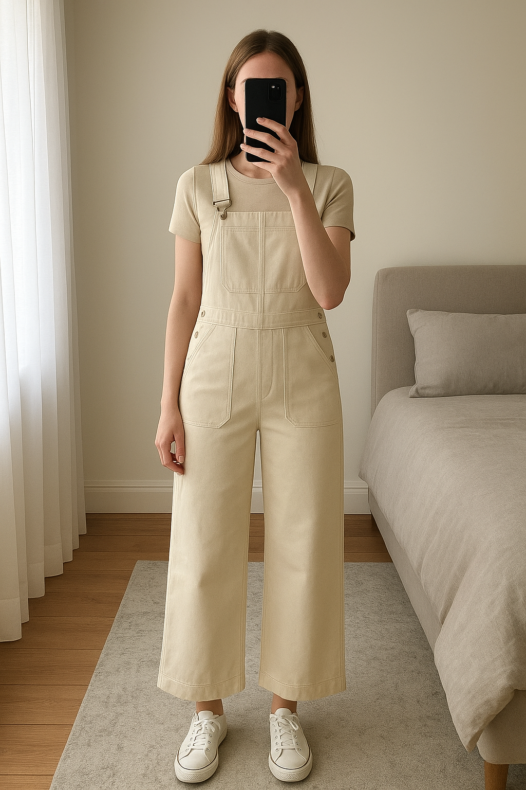 Salopette écru soeur debout, face à la caméra, dans une chambre à la lumière douce, avec une lumière naturelle filtrant par la fenêtre.