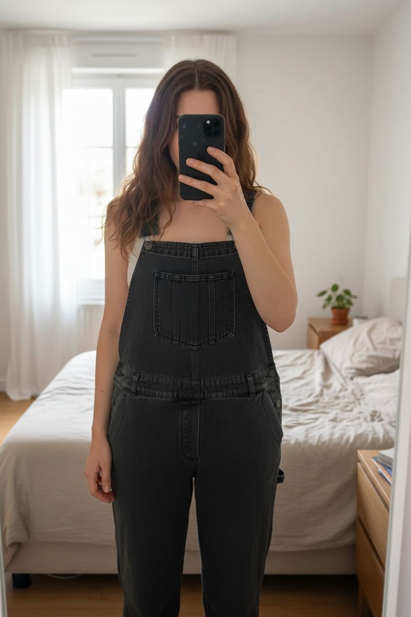 Salopette en jean noir – Modetrotter debout, face à la caméra, dans une chambre à la lumière douce, avec une lumière naturelle filtrant par la fenêtre.