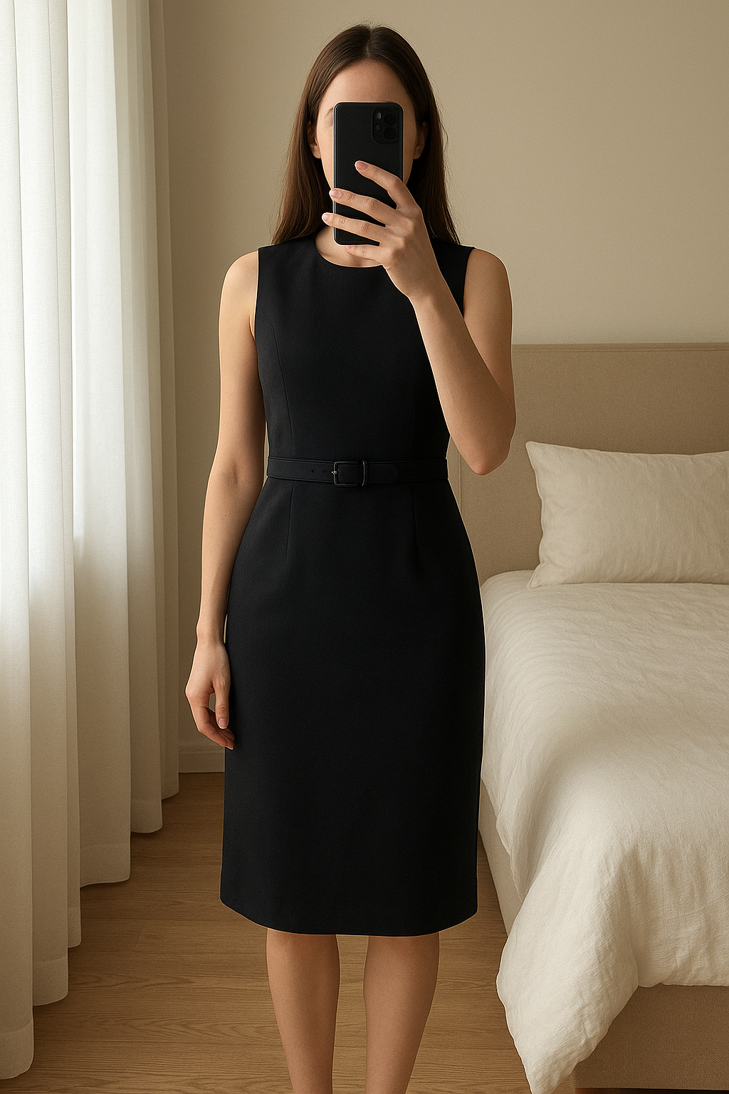 Schwarzes Etuikleid mit Gürtel / y2k / japanstyle / Old Money Style / Vintage Dressing aufrecht stehend, der Kamera zugewandt, in einem sanft beleuchteten Schlafzimmer, mit natürlichem Licht, das durch ein Fenster fällt.