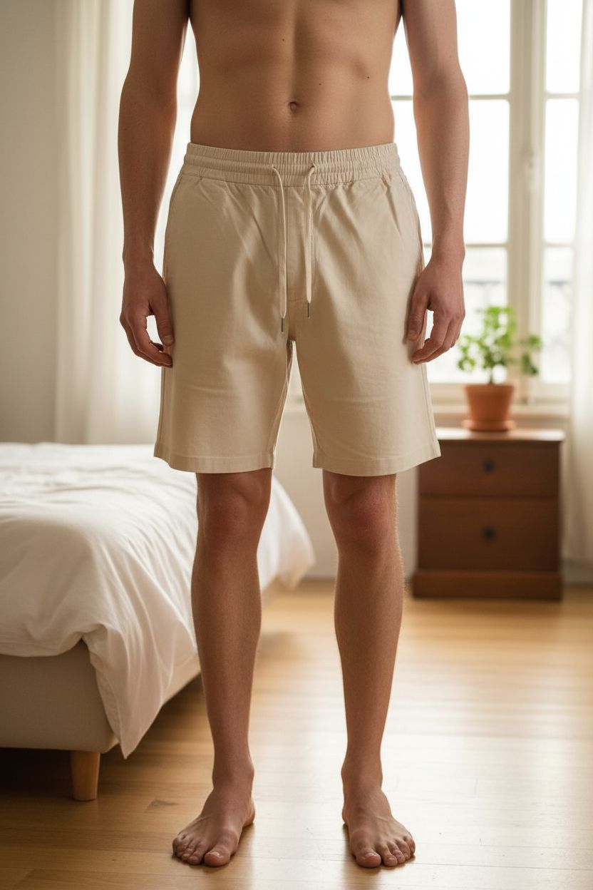 Une personne en Short homme Sandro beige TS neuf debout, face à la caméra, avec une silhouette fine, dans une chambre à la lumière douce, avec une lumière naturelle filtrant par la fenêtre.