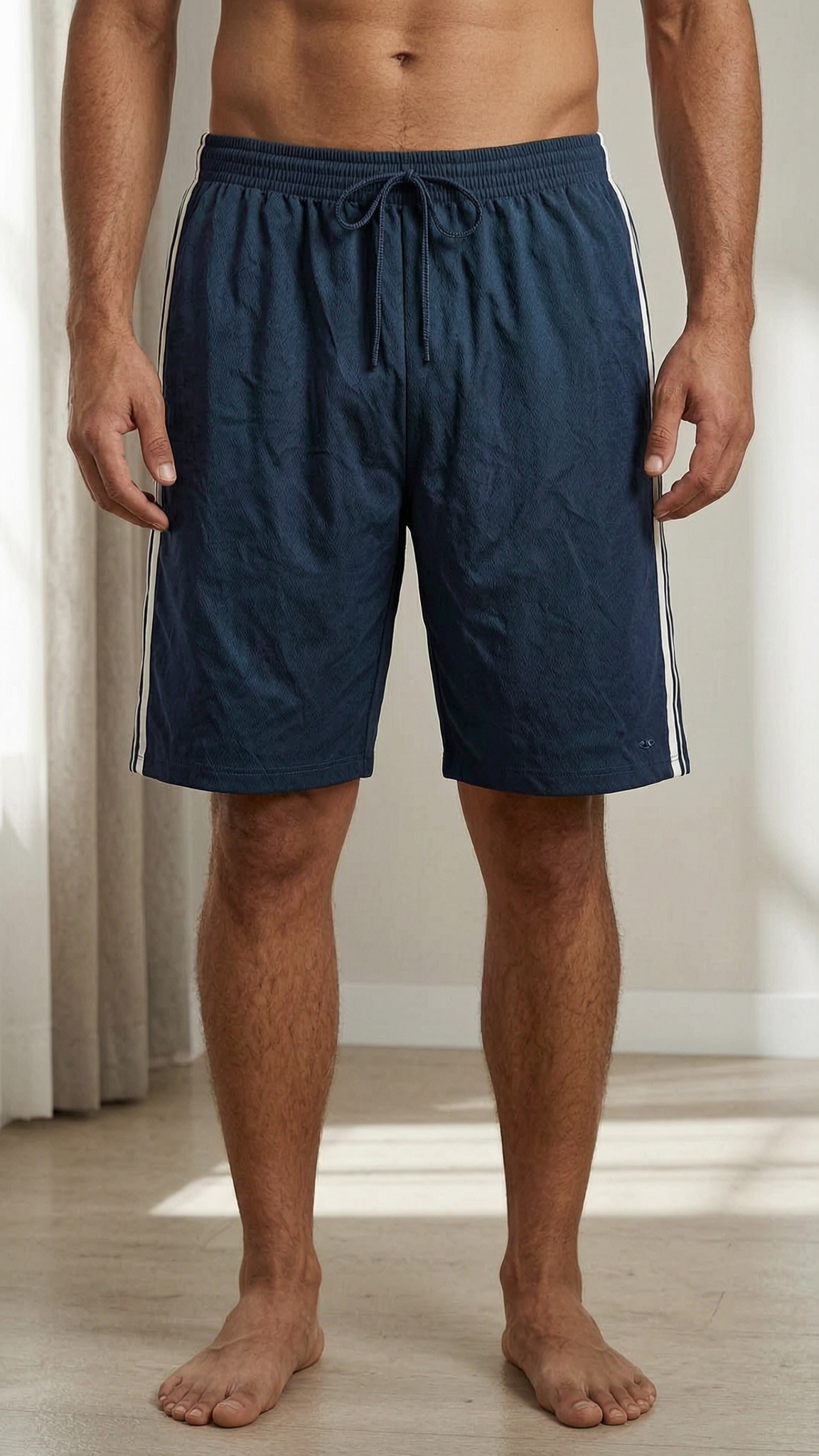 Une personne en Short long Champion marine taille XL debout, face à la caméra, dans une chambre à la lumière douce, avec une lumière naturelle filtrant par la fenêtre.