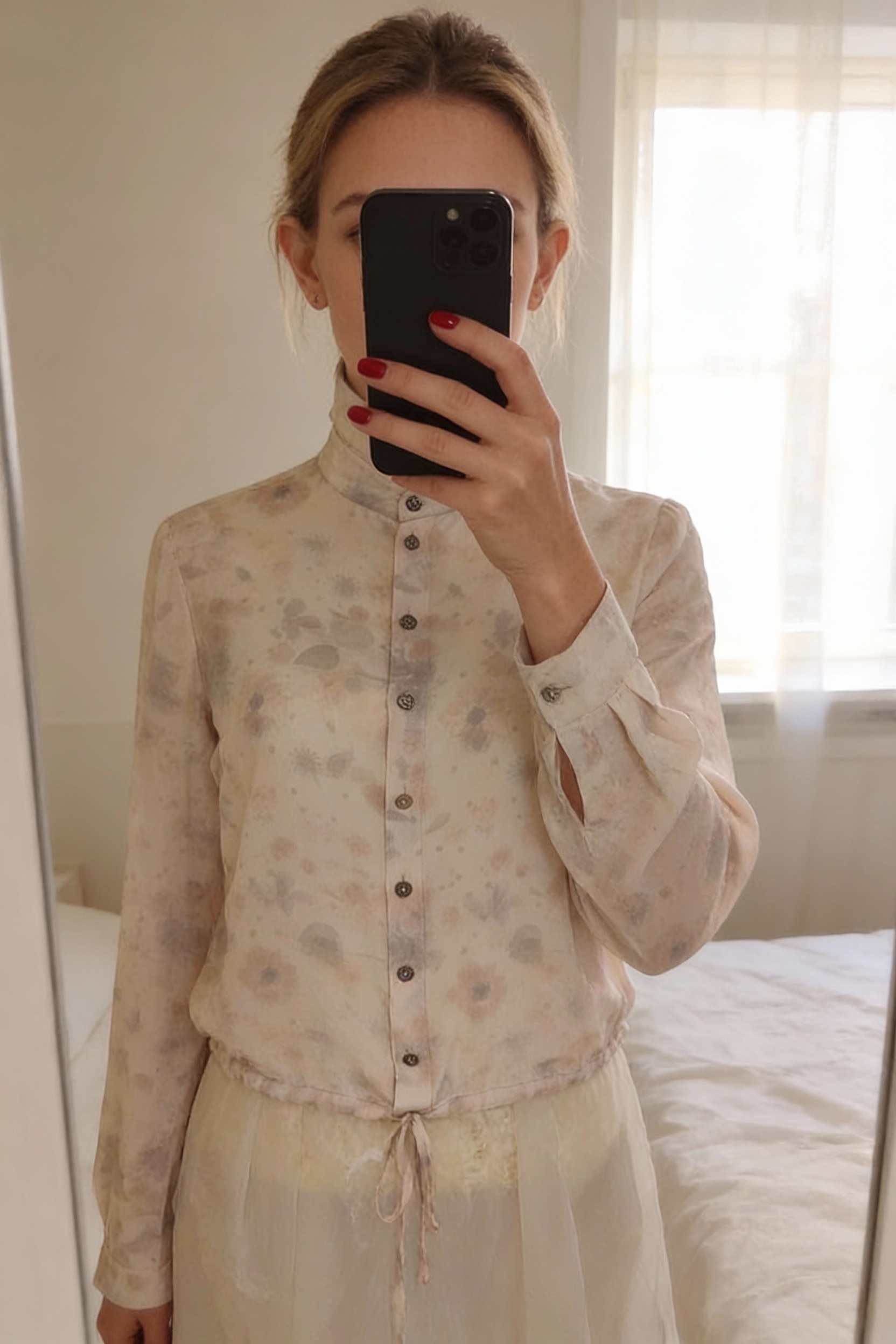Silk blouse Mulberry debout, face à la caméra, dans une chambre à la lumière douce, avec une lumière naturelle filtrant par la fenêtre.