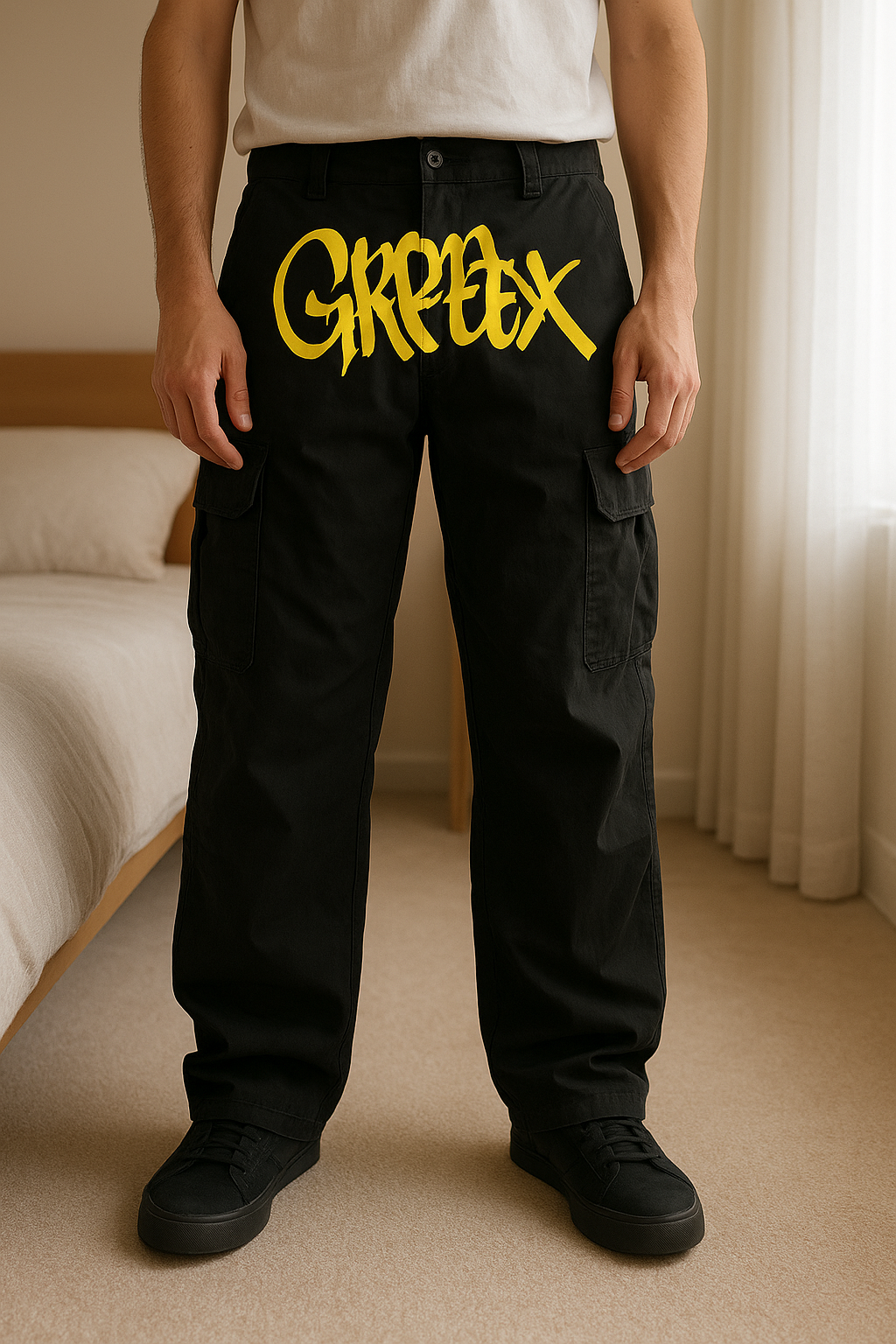 Spodnie REVIEW cargo baggy standing straight facing the camera, in a softly lit bedroom setting, with gentle natural light filtering through a window.