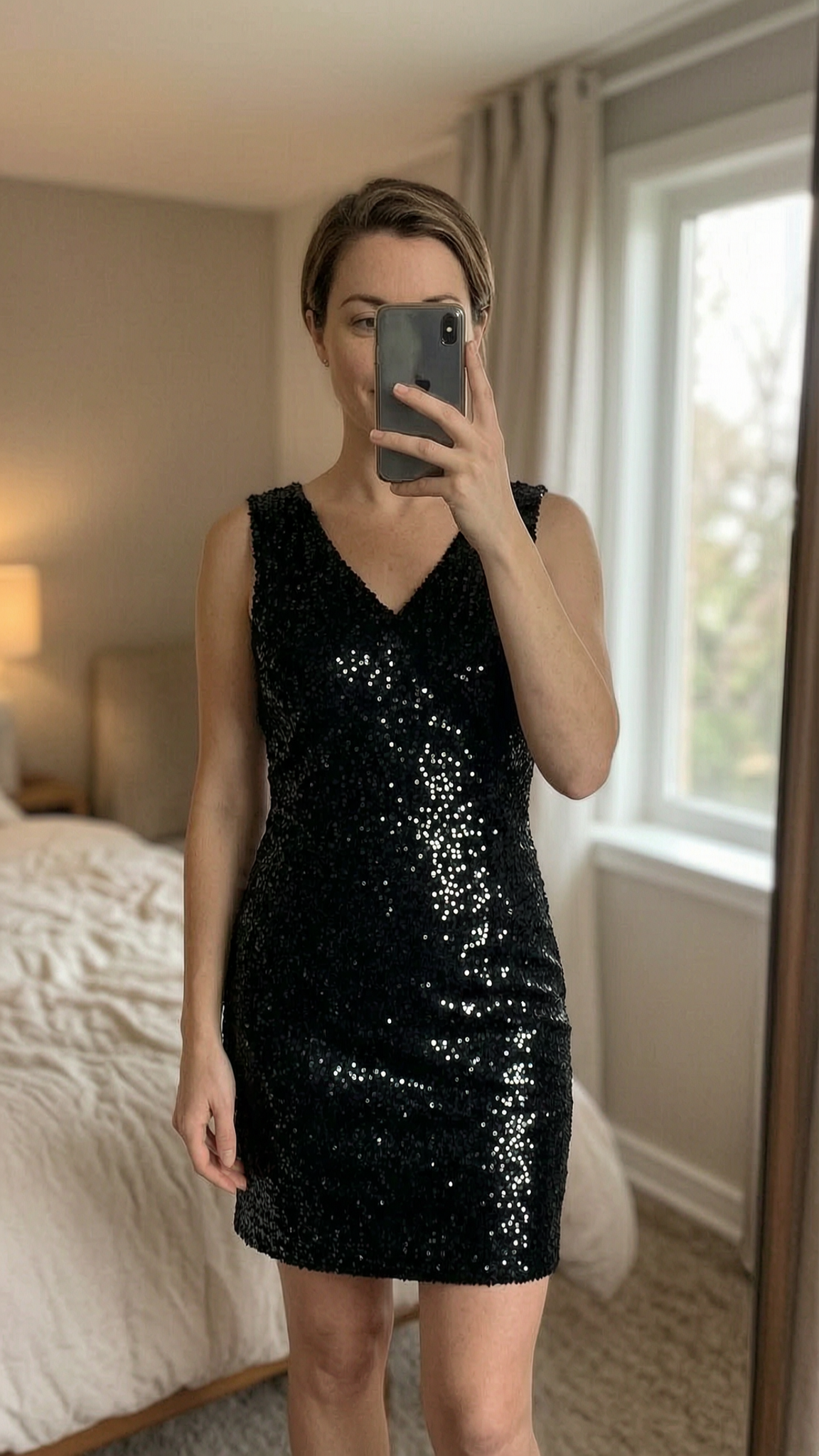 Stunning Wallis Petite Black Sequin Spring/Summer Occasion Dress Size 10 standing straight facing the camera, in a softly lit bedroom setting, with gentle natural light filtering through a window.