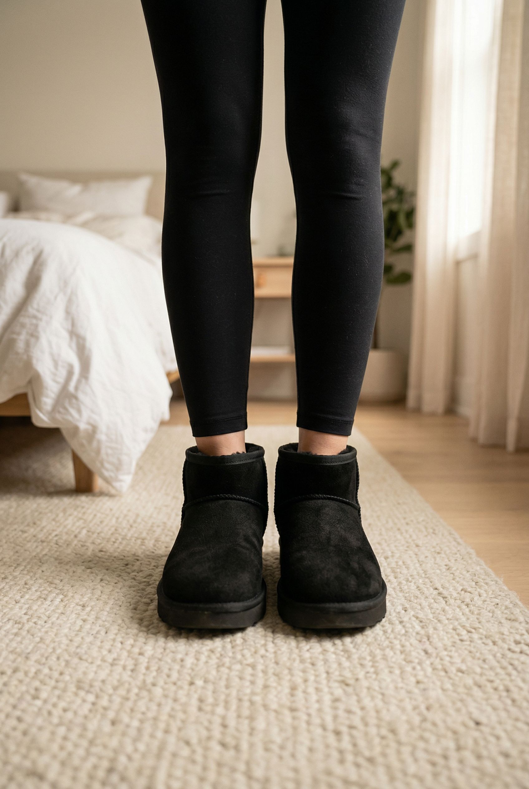 Style Ugg mini noir debout, face à la caméra, dans une chambre à la lumière douce, avec une lumière naturelle filtrant par la fenêtre.