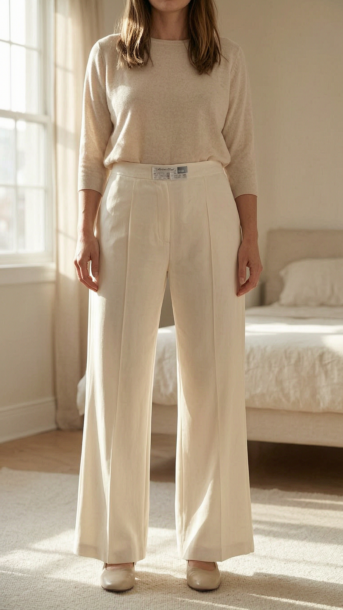 Summer pants MaxMara size 36 debout, face à la caméra, dans une chambre à la lumière douce, avec une lumière naturelle filtrant par la fenêtre.