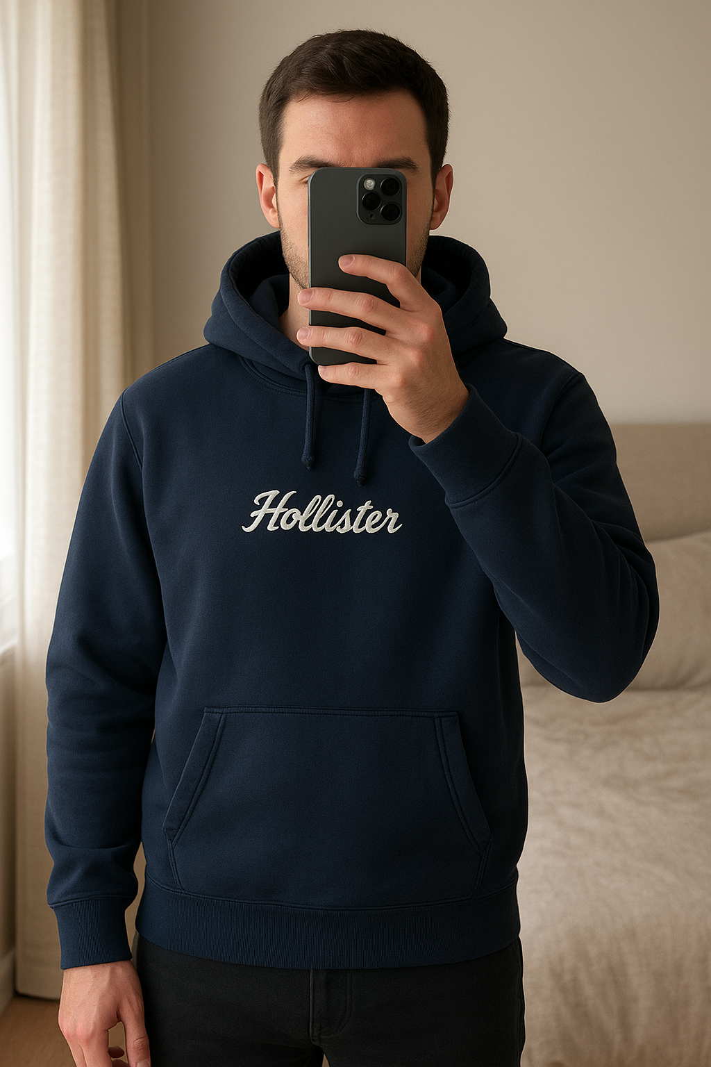 Sweat à capuche Hollister noir 🖤 debout, face à la caméra, dans une chambre à la lumière douce, avec une lumière naturelle filtrant par la fenêtre.