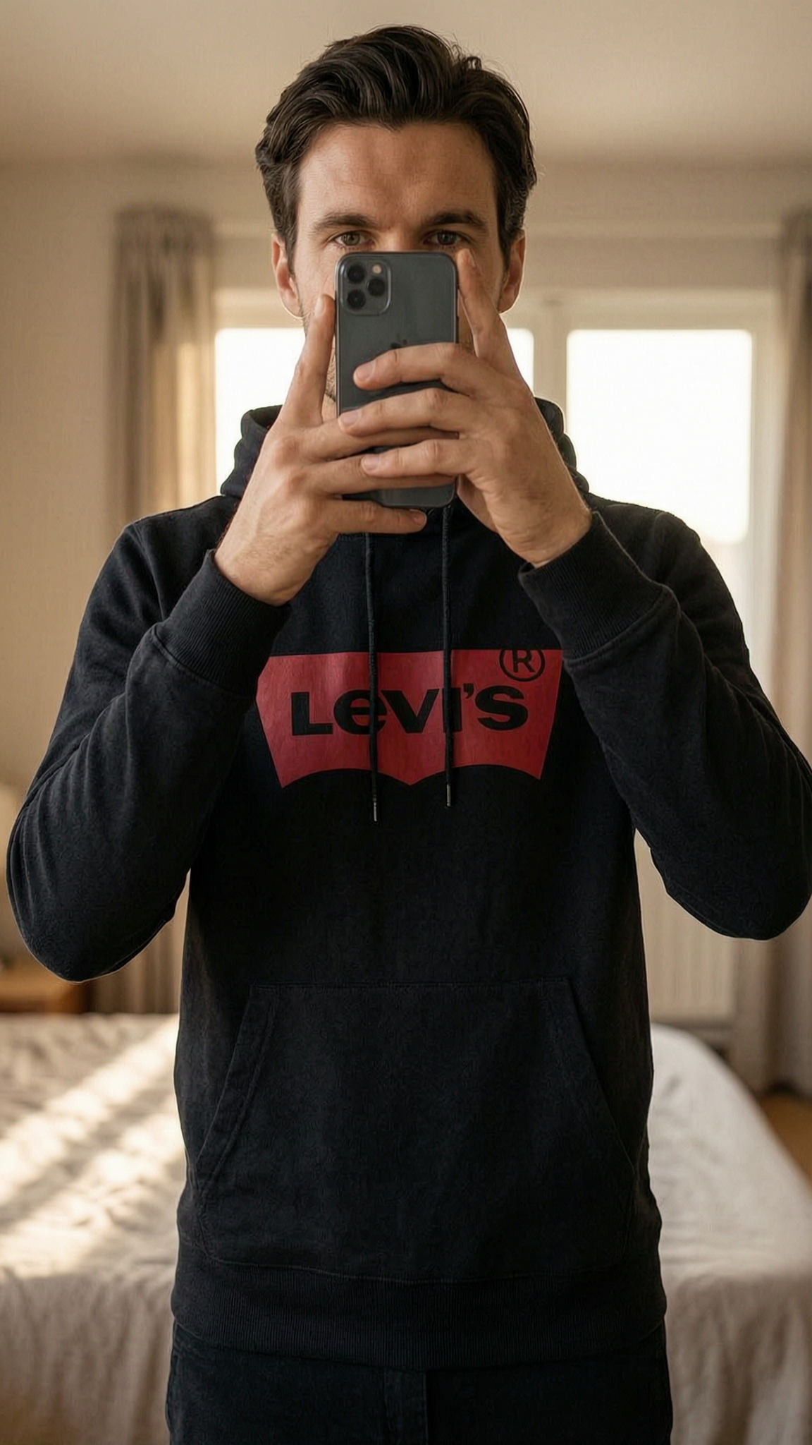 Une personne en Sweat à capuche Levi's noir logo rouge - Taille S debout, face à la caméra, dans une chambre à la lumière douce, avec une lumière naturelle filtrant par la fenêtre.