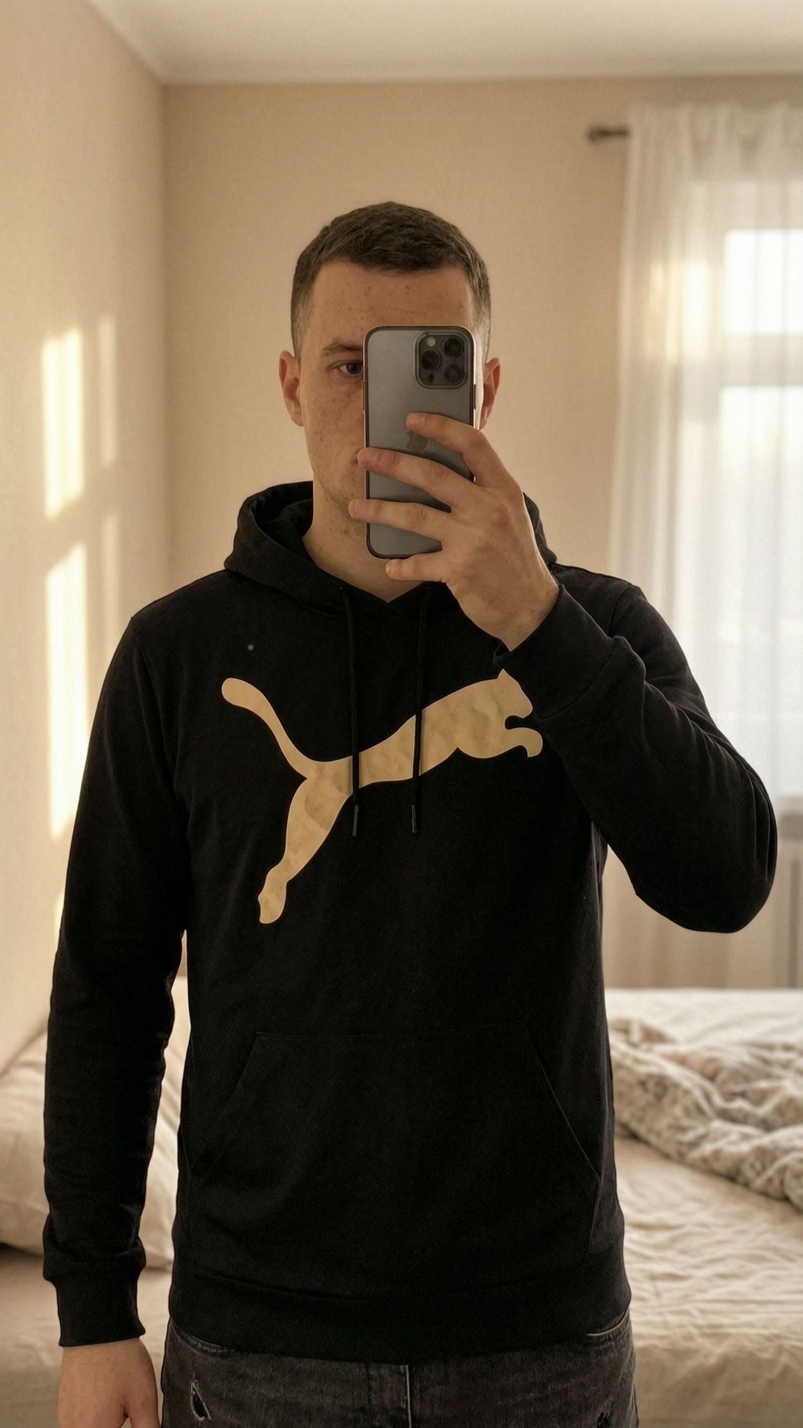 Une personne en Sweat à capuche Puma noir logo XXL - Taille 14/16 ans debout, face à la caméra, dans une chambre à la lumière douce, avec une lumière naturelle filtrant par la fenêtre.
