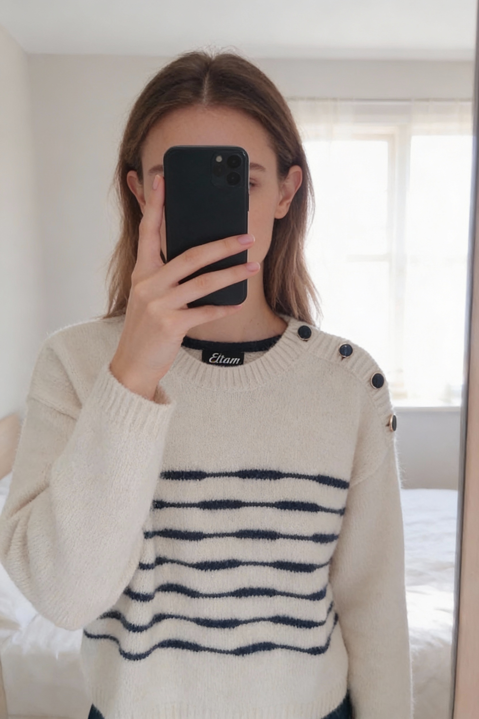 Sweat Etam debout, face à la caméra, dans une chambre à la lumière douce, avec une lumière naturelle filtrant par la fenêtre.