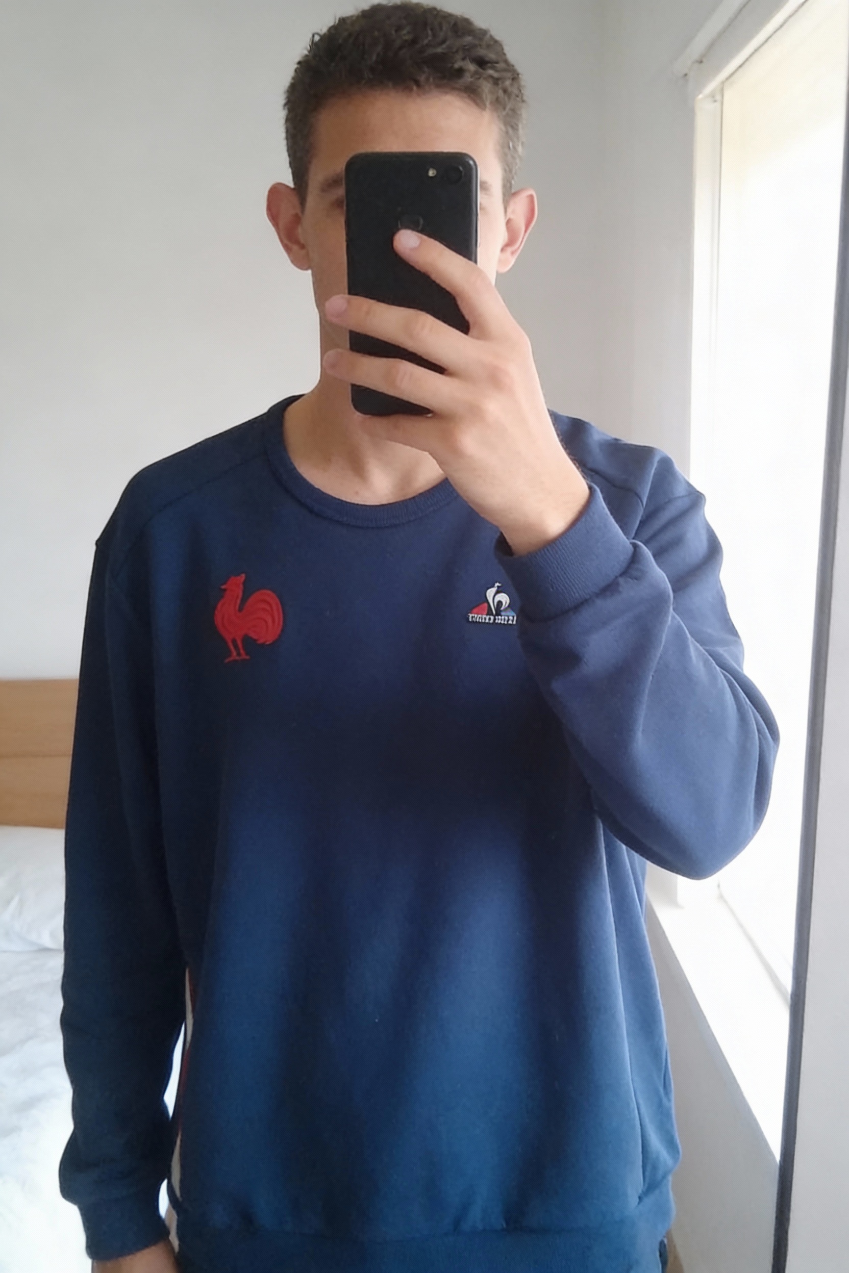 sweat homme. debout, face à la caméra, dans une chambre à la lumière douce, avec une lumière naturelle filtrant par la fenêtre.
