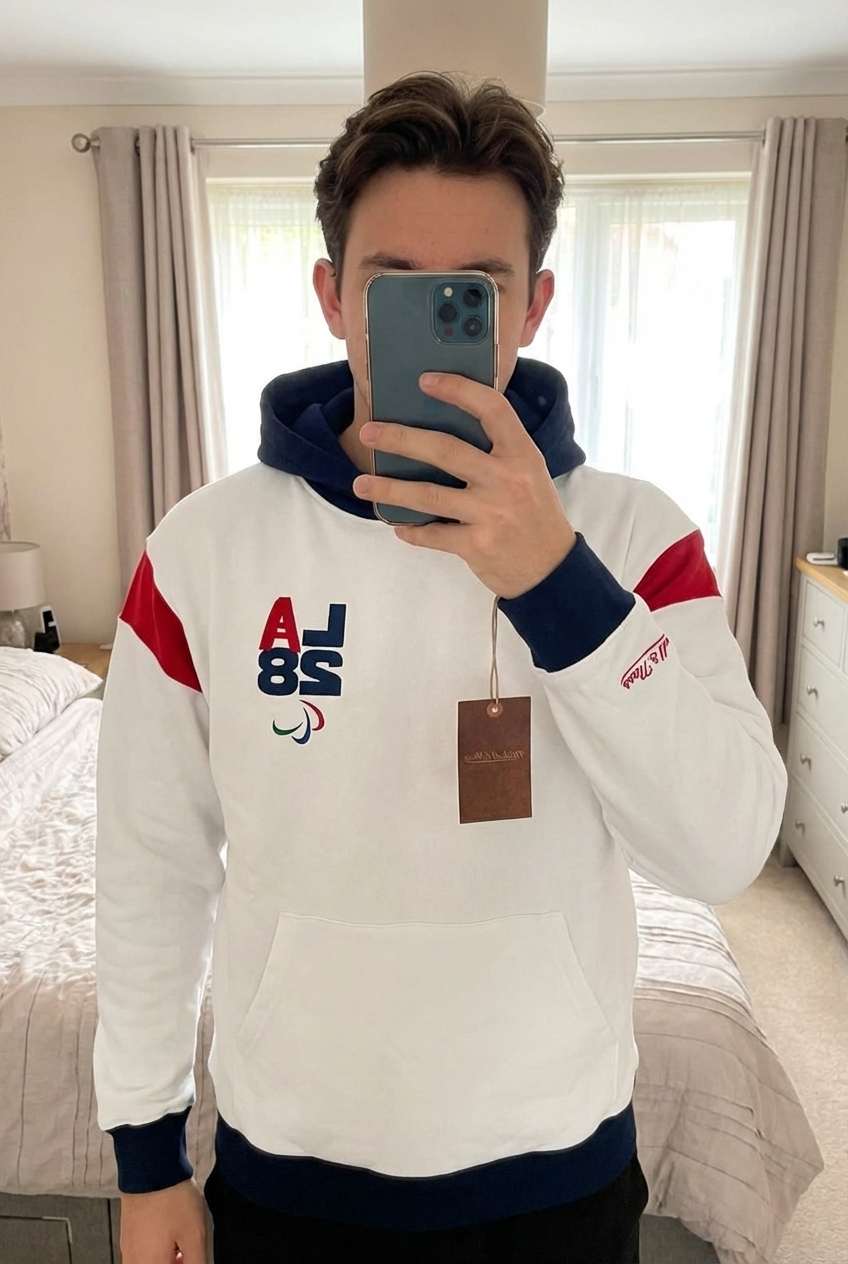 Une personne en Sweat mitschell nous LA 2028 debout, face à la caméra, dans une chambre à la lumière douce, avec une lumière naturelle filtrant par la fenêtre.