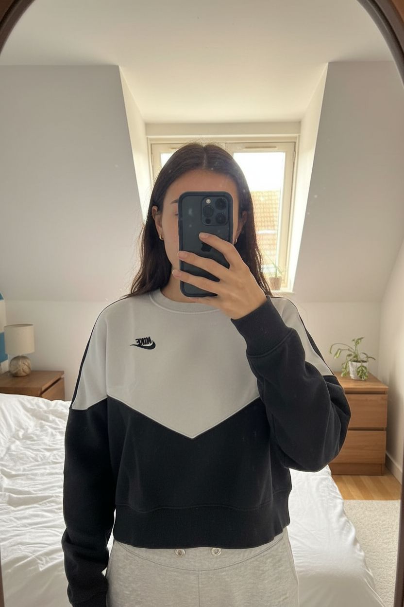 Sweat Nike blanc et gris foncé/noir debout, face à la caméra, dans une chambre à la lumière douce, avec une lumière naturelle filtrant par la fenêtre.