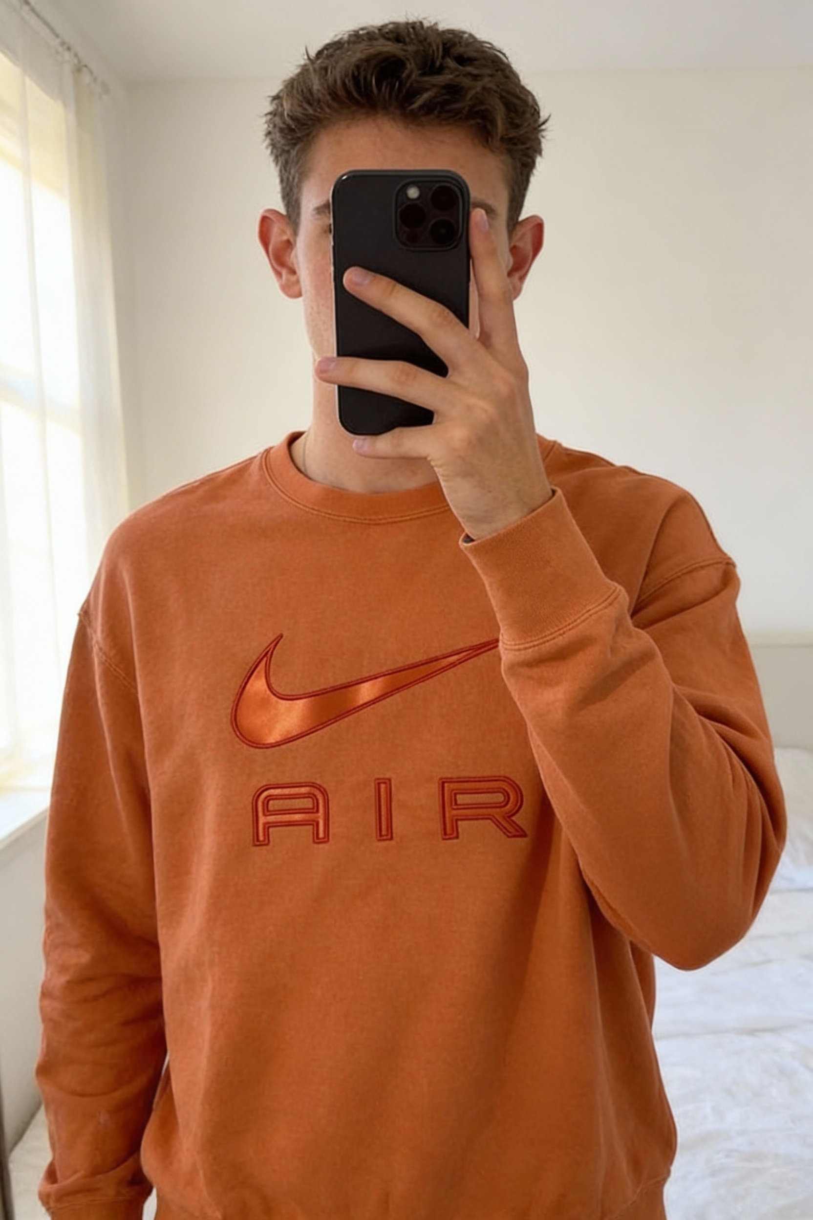 Sweat oversize Nike couleur orange pastel taille S / 36 debout, face à la caméra, dans une chambre à la lumière douce, avec une lumière naturelle filtrant par la fenêtre.