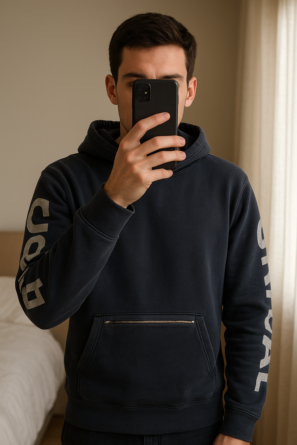 Sweat Palace noir homme debout, face à la caméra, dans une chambre à la lumière douce, avec une lumière naturelle filtrant par la fenêtre.