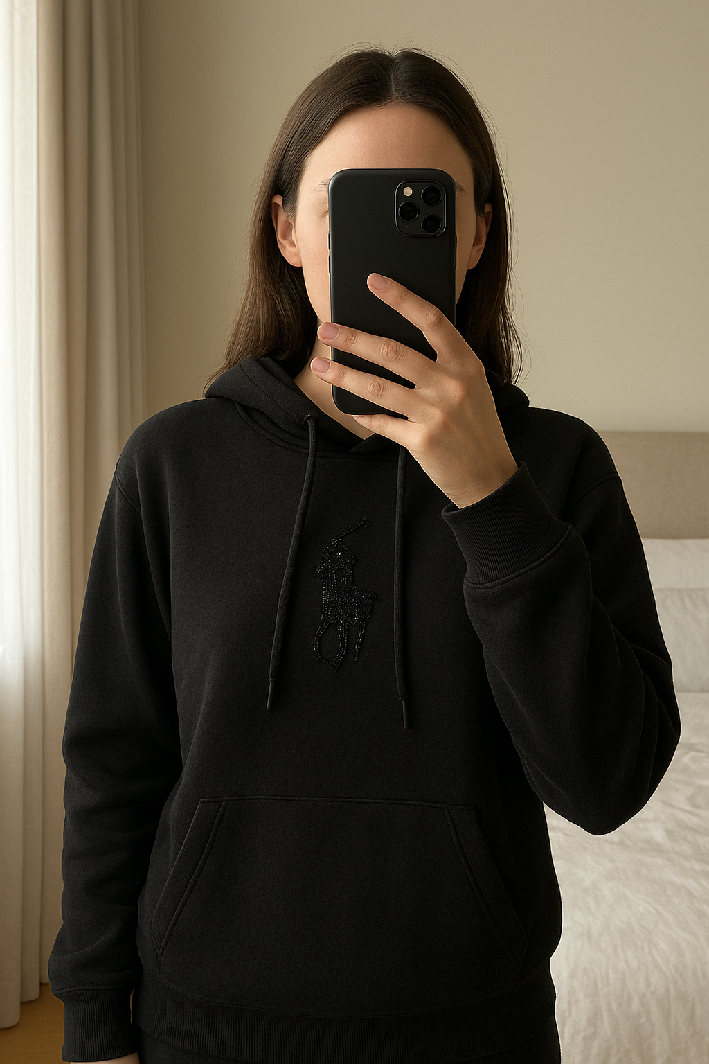 Sweat Ralph Lauren femme debout, face à la caméra, dans une chambre à la lumière douce, avec une lumière naturelle filtrant par la fenêtre.