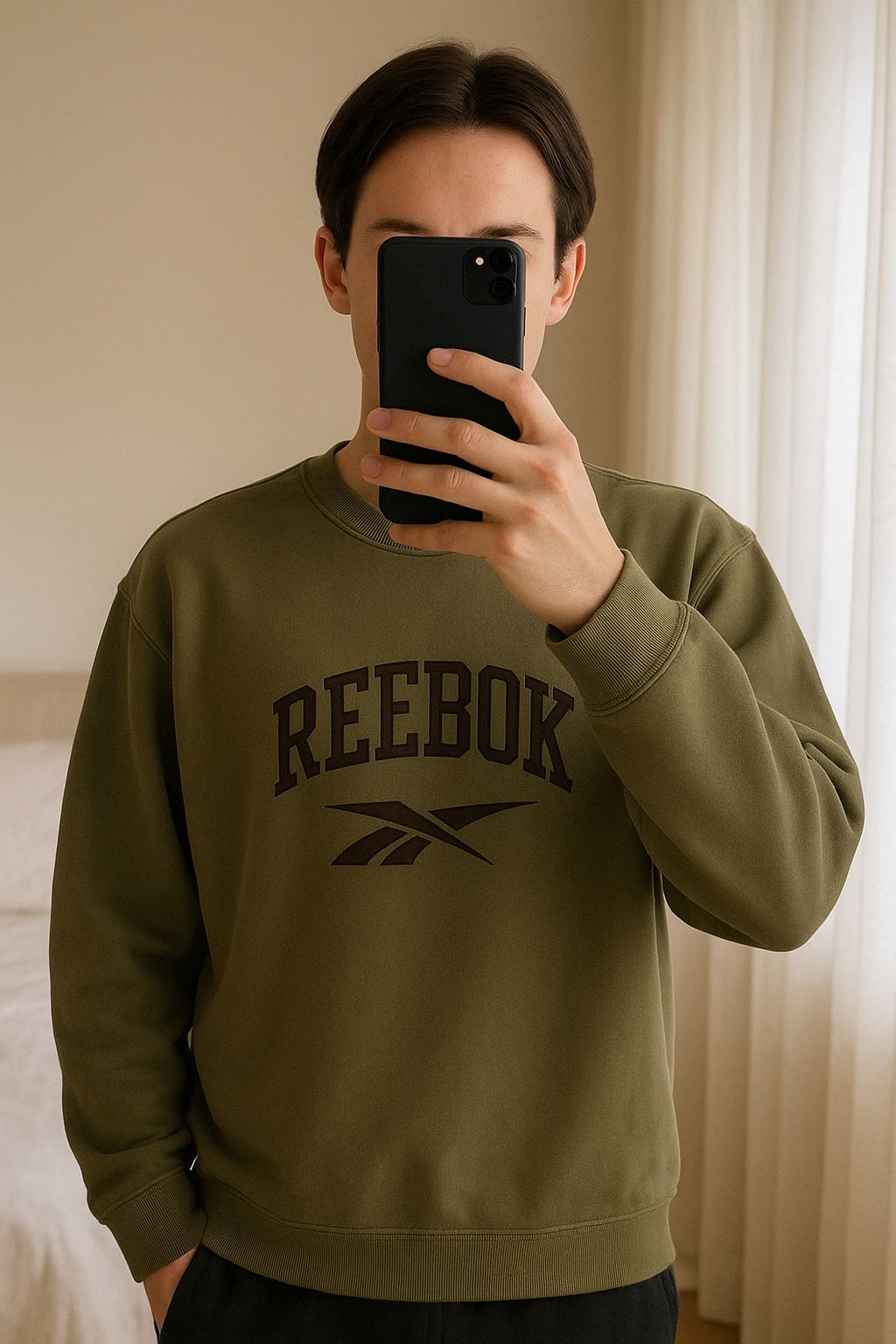 Sweat Reebok vintage kaki debout, face à la caméra, dans une chambre à la lumière douce, avec une lumière naturelle filtrant par la fenêtre.