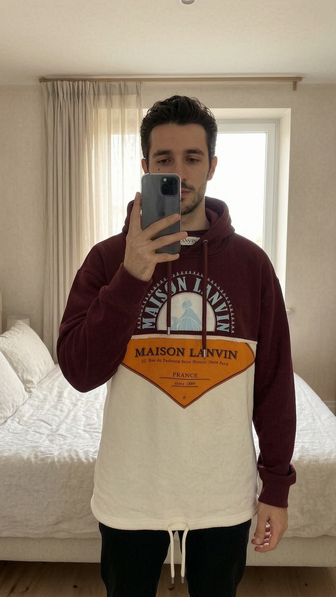 Sweat-shirt à capuche Lanvin Paris debout, face à la caméra, dans une chambre à la lumière douce, avec une lumière naturelle filtrant par la fenêtre.