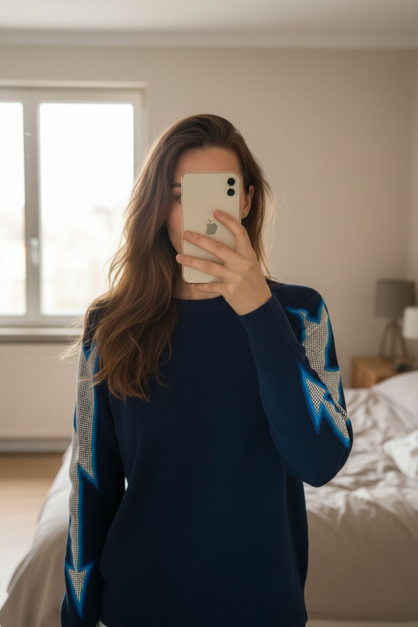 Une personne en Sweat shirt Sandro Bleu eclair t36 neuf debout, face à la caméra, avec une silhouette fine, dans une chambre à la lumière douce, avec une lumière naturelle filtrant par la fenêtre.