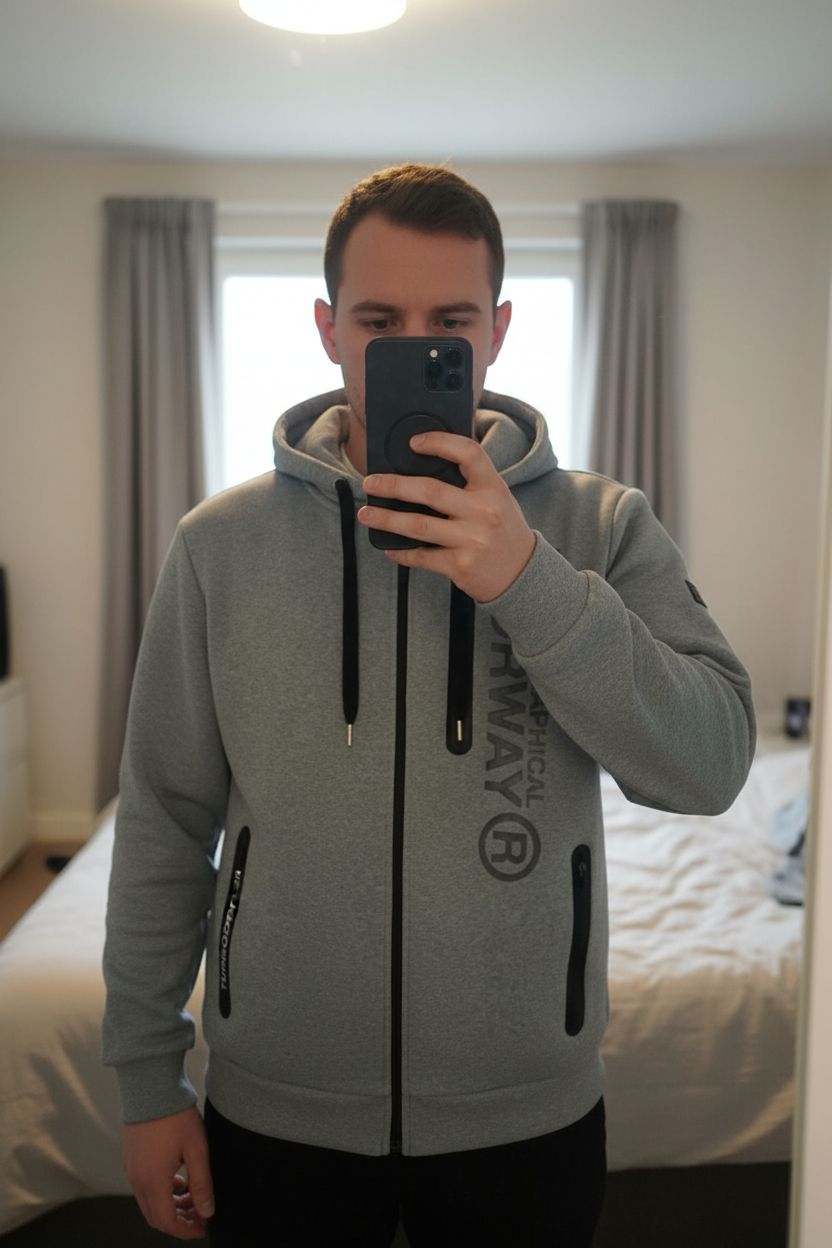 Sweat zippé à capuche XXL Geographical Norway gris chiné debout, face à la caméra, dans une chambre à la lumière douce, avec une lumière naturelle filtrant par la fenêtre.