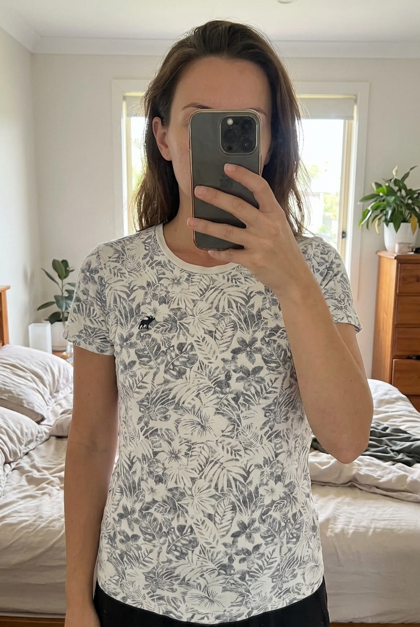 Une personne en T-shirt Abercrombie & Fitch debout, face à la caméra, dans une chambre à la lumière douce, avec une lumière naturelle filtrant par la fenêtre.