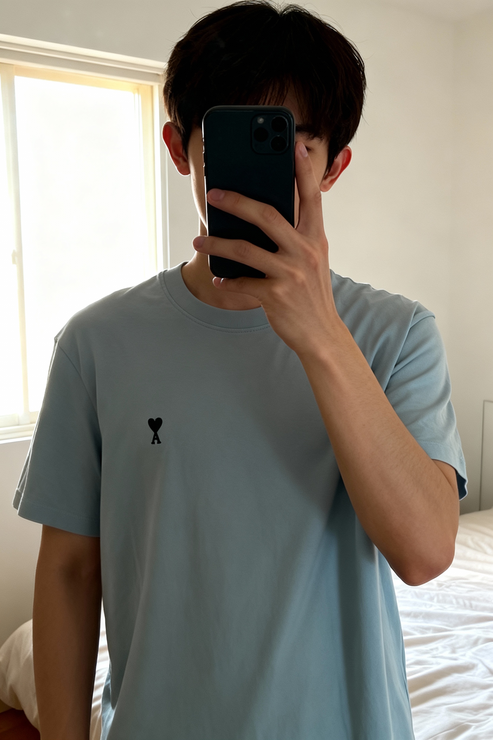 T shirt AMI Paris debout, face à la caméra, dans une chambre à la lumière douce, avec une lumière naturelle filtrant par la fenêtre.