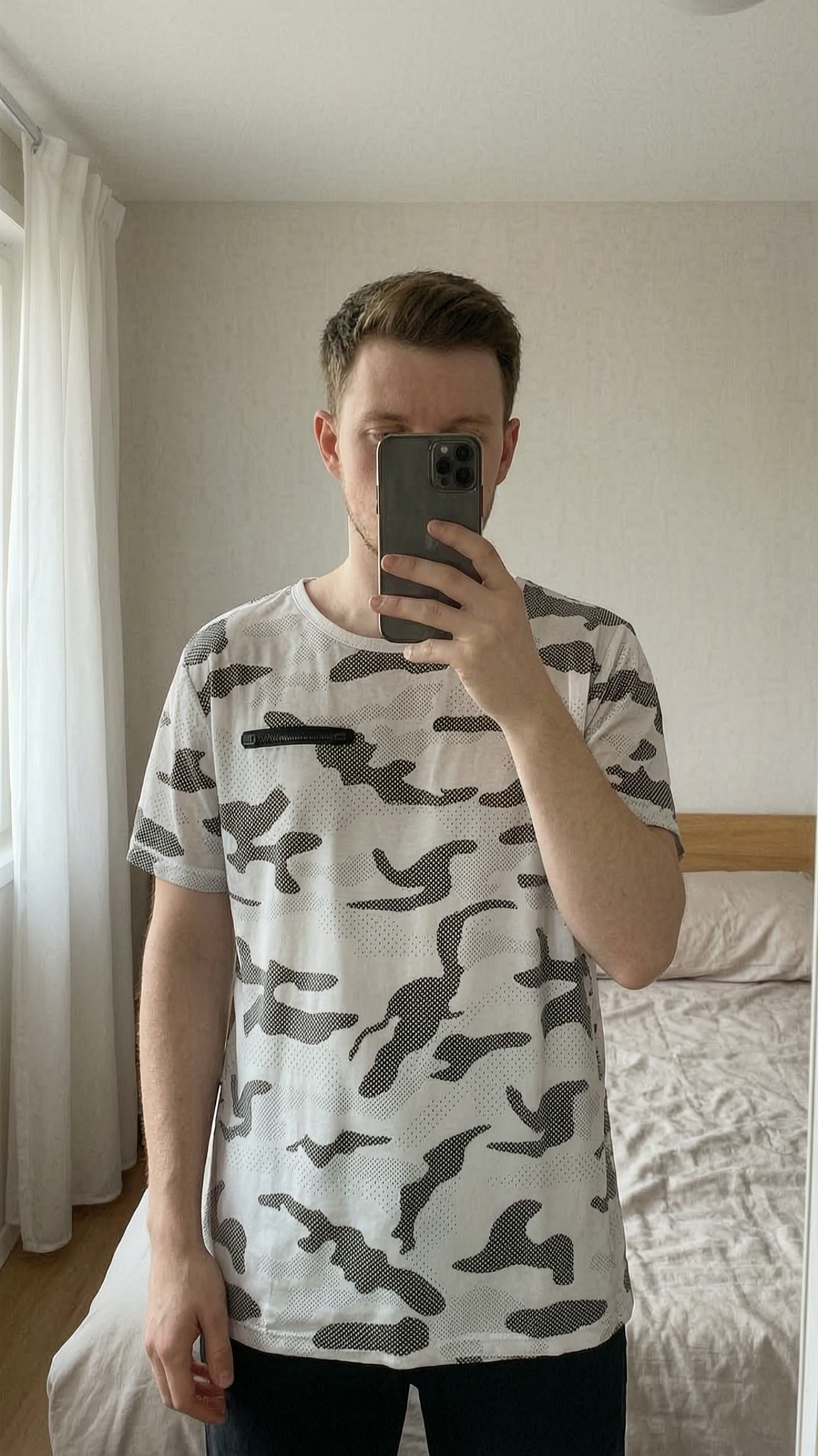T-shirt blanc et noir debout, face à la caméra, dans une chambre à la lumière douce, avec une lumière naturelle filtrant par la fenêtre.