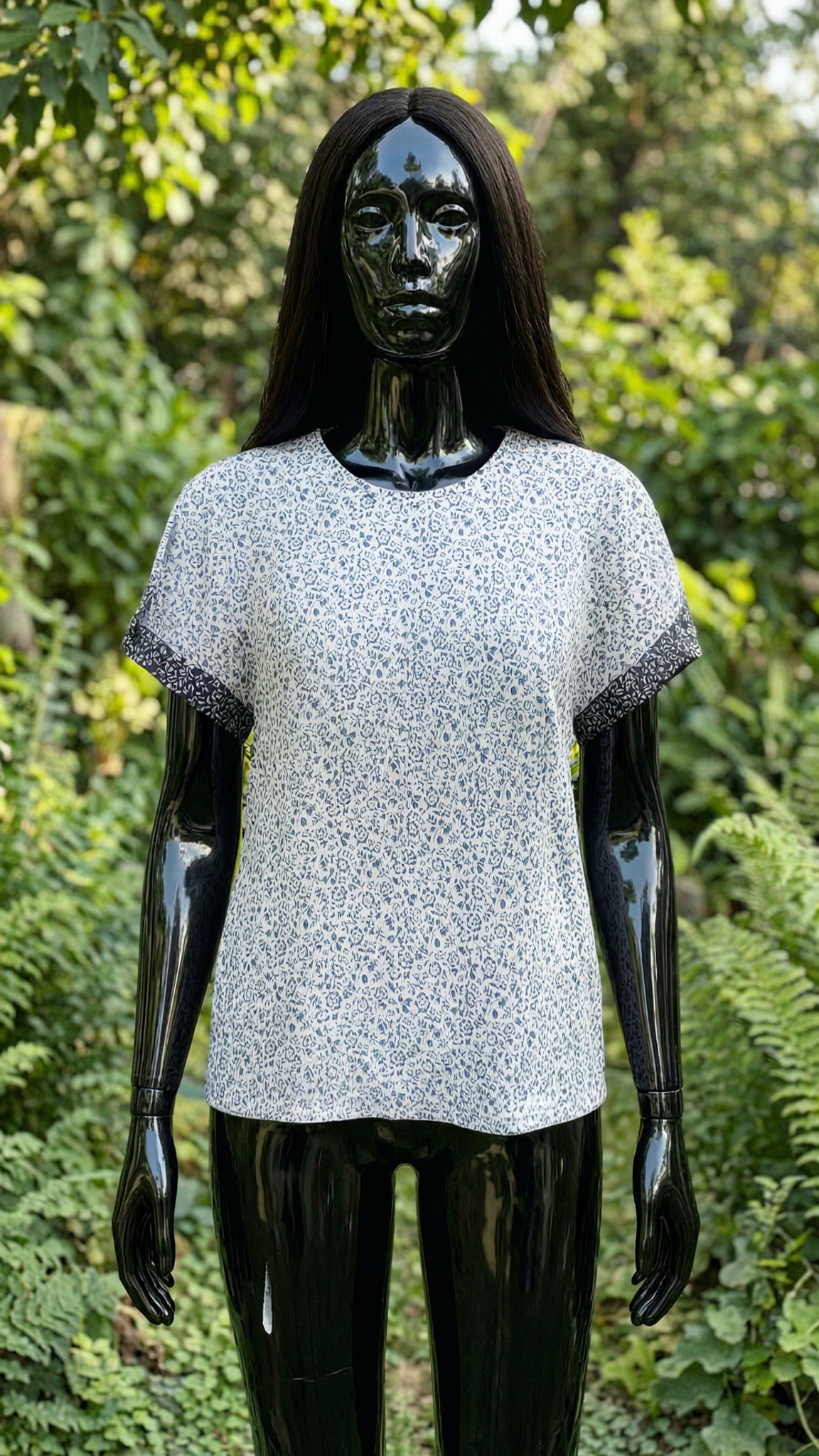 un mannequin noir brillant en plastique, sans traits du visage en T-shirt blanc à fleurs bleues marine, taille 36/38, Marque Intimissimi debout, face à la caméra, avec une silhouette fine, en extérieur, dans un cadre naturel entouré de verdure et de lumière douce.