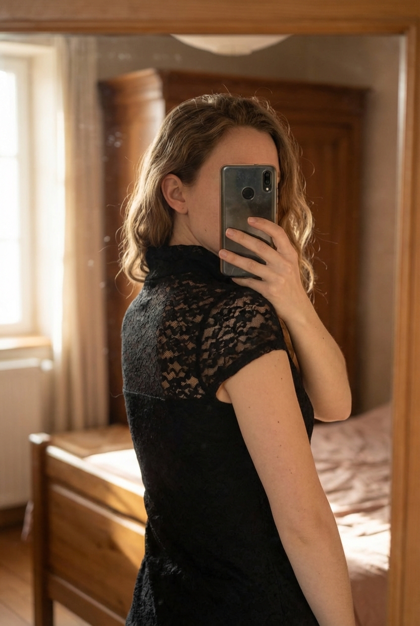 T-shirt dentelle debout, face à la caméra, dans une chambre à la lumière douce, avec une lumière naturelle filtrant par la fenêtre.