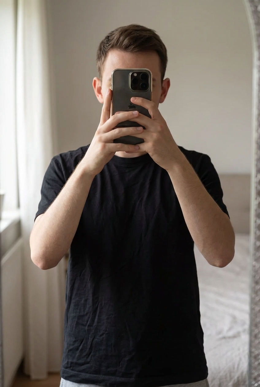 T-shirt H&M debout, face à la caméra, dans une chambre à la lumière douce, avec une lumière naturelle filtrant par la fenêtre.