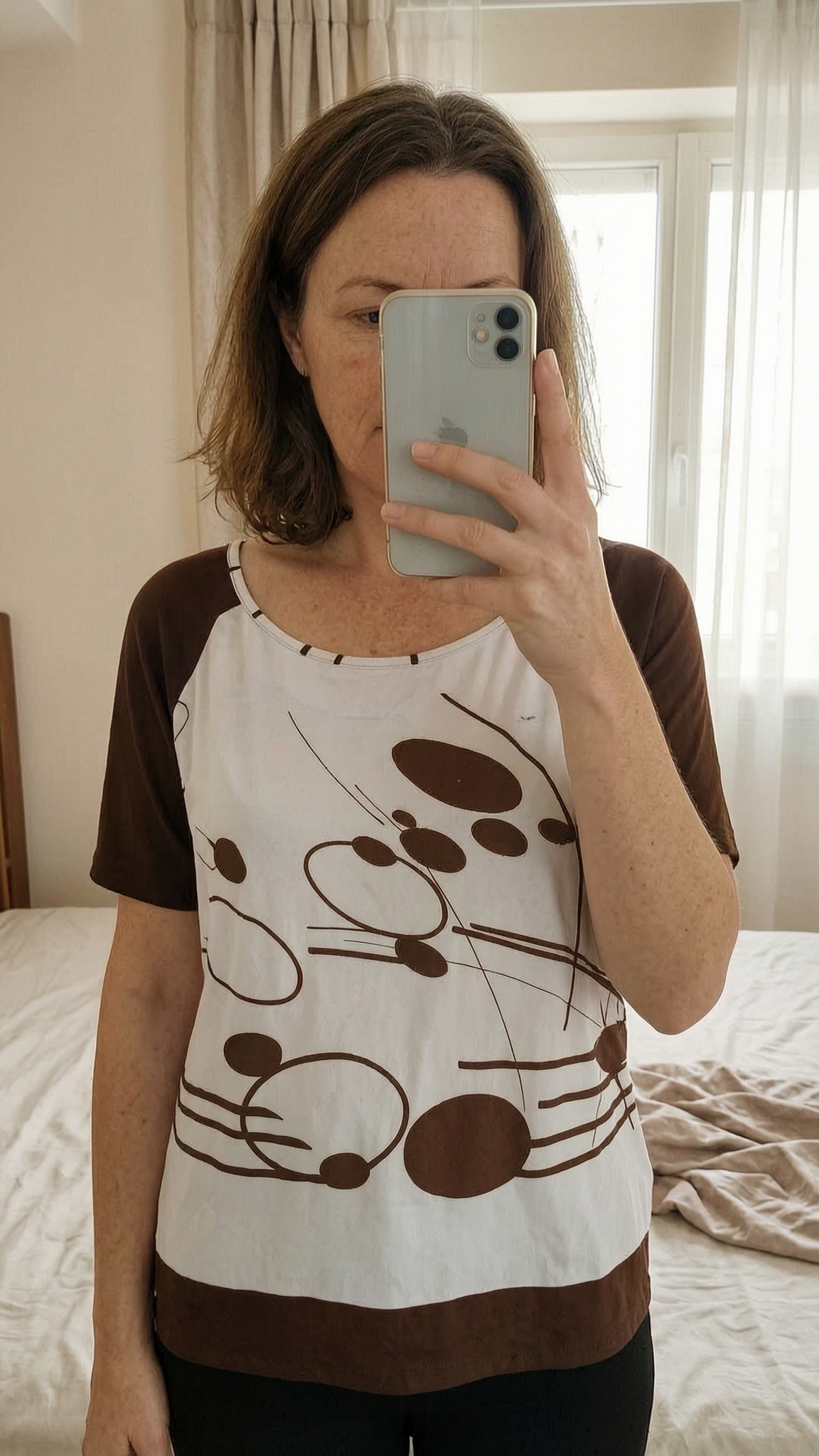 T-shirt imprimé blanc et brun taille M/L debout, face à la caméra, dans une chambre à la lumière douce, avec une lumière naturelle filtrant par la fenêtre.