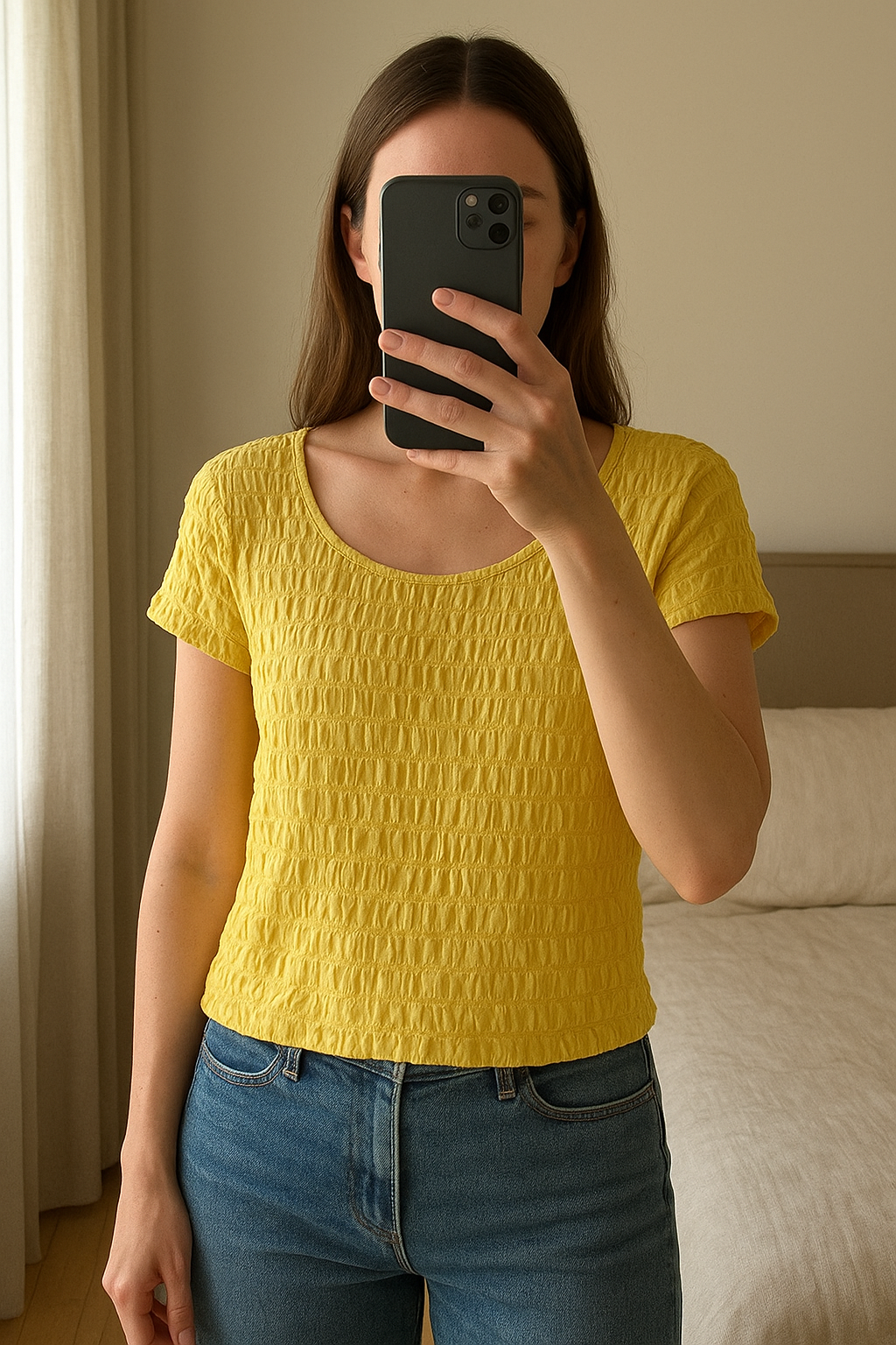 T shirt jaune gaufré neuf debout, face à la caméra, dans une chambre à la lumière douce, avec une lumière naturelle filtrant par la fenêtre.