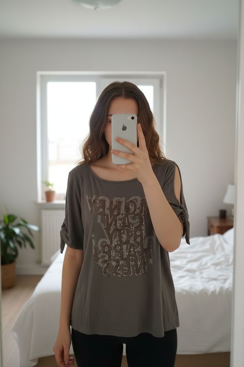 T-shirt kaki imprimé, avec paillettes, Taille M, Marque Zara Basic debout, face à la caméra, dans une chambre à la lumière douce, avec une lumière naturelle filtrant par la fenêtre.