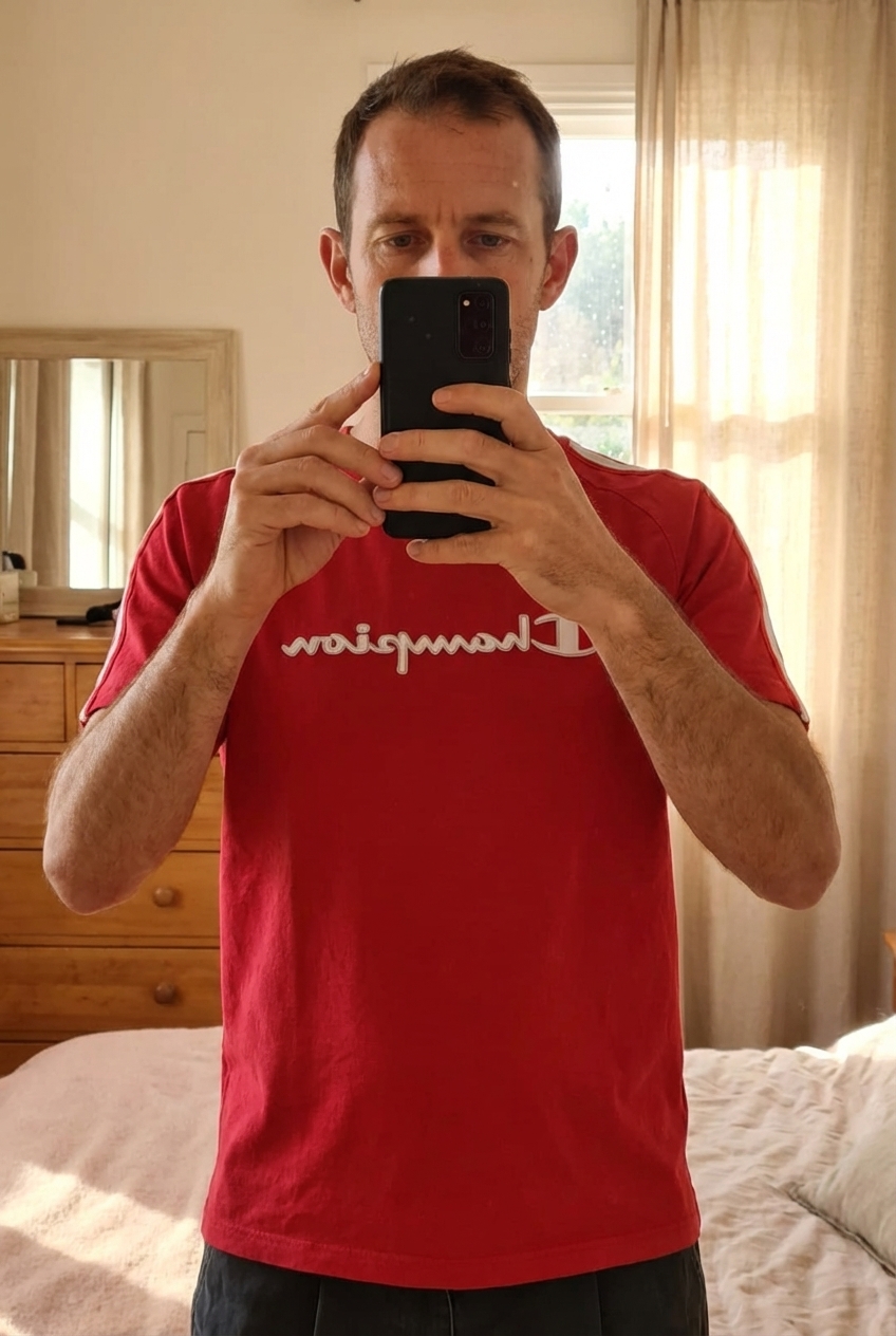 T-shirt manche courte -taille L debout, face à la caméra, dans une chambre à la lumière douce, avec une lumière naturelle filtrant par la fenêtre.
