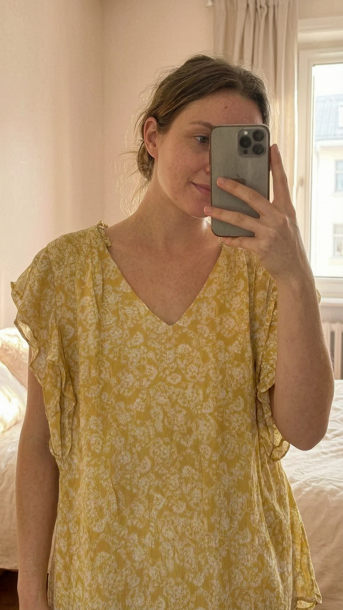 Une personne en T-shirt manches courtes maison 123 taille 42 excellent état cambrant légèrement le dos pour une pose dynamique, avec une silhouette fine, dans une chambre à la lumière douce, avec une lumière naturelle filtrant par la fenêtre.