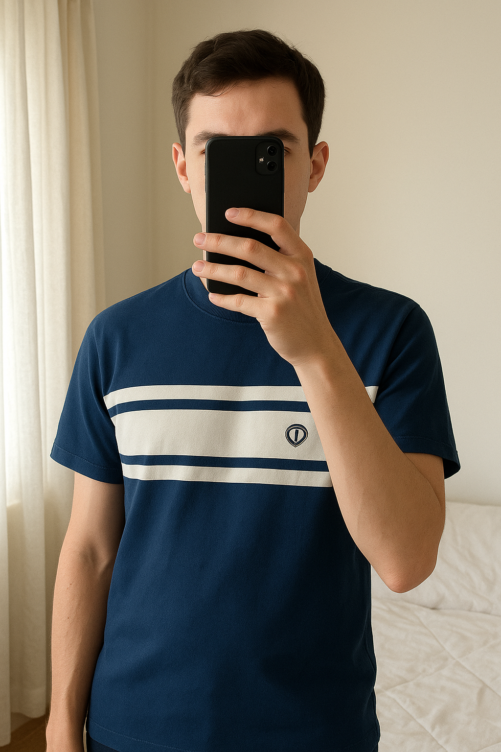T-shirt Nike bleu et blanc. Coupe sportive rétro style années 2000, look vintage en très bonne état. debout, face à la caméra, dans une chambre à la lumière douce, avec une lumière naturelle filtrant par la fenêtre.