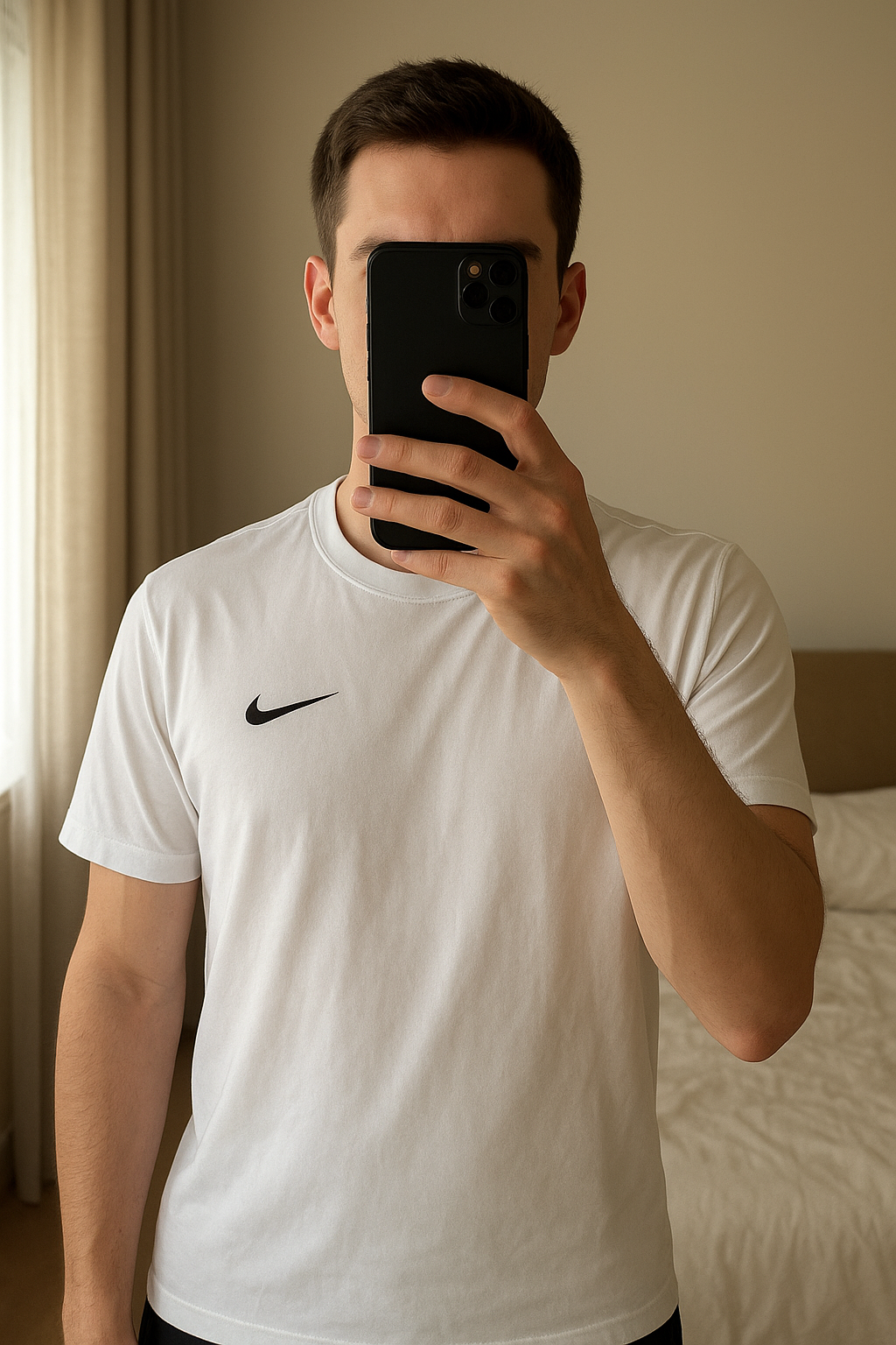 T-shirt Nike Dri-FIT blanc 👕 debout, face à la caméra, dans une chambre à la lumière douce, avec une lumière naturelle filtrant par la fenêtre.