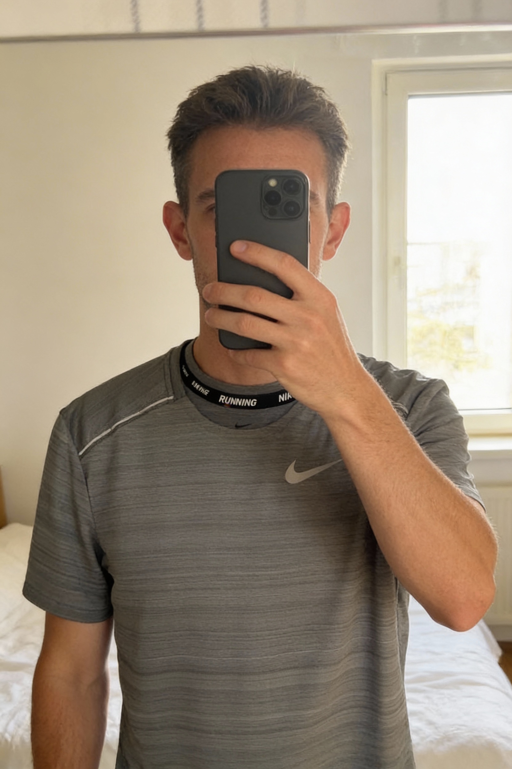 T-shirt Nike Running Dri-Fit 🏃 debout, face à la caméra, dans une chambre à la lumière douce, avec une lumière naturelle filtrant par la fenêtre.