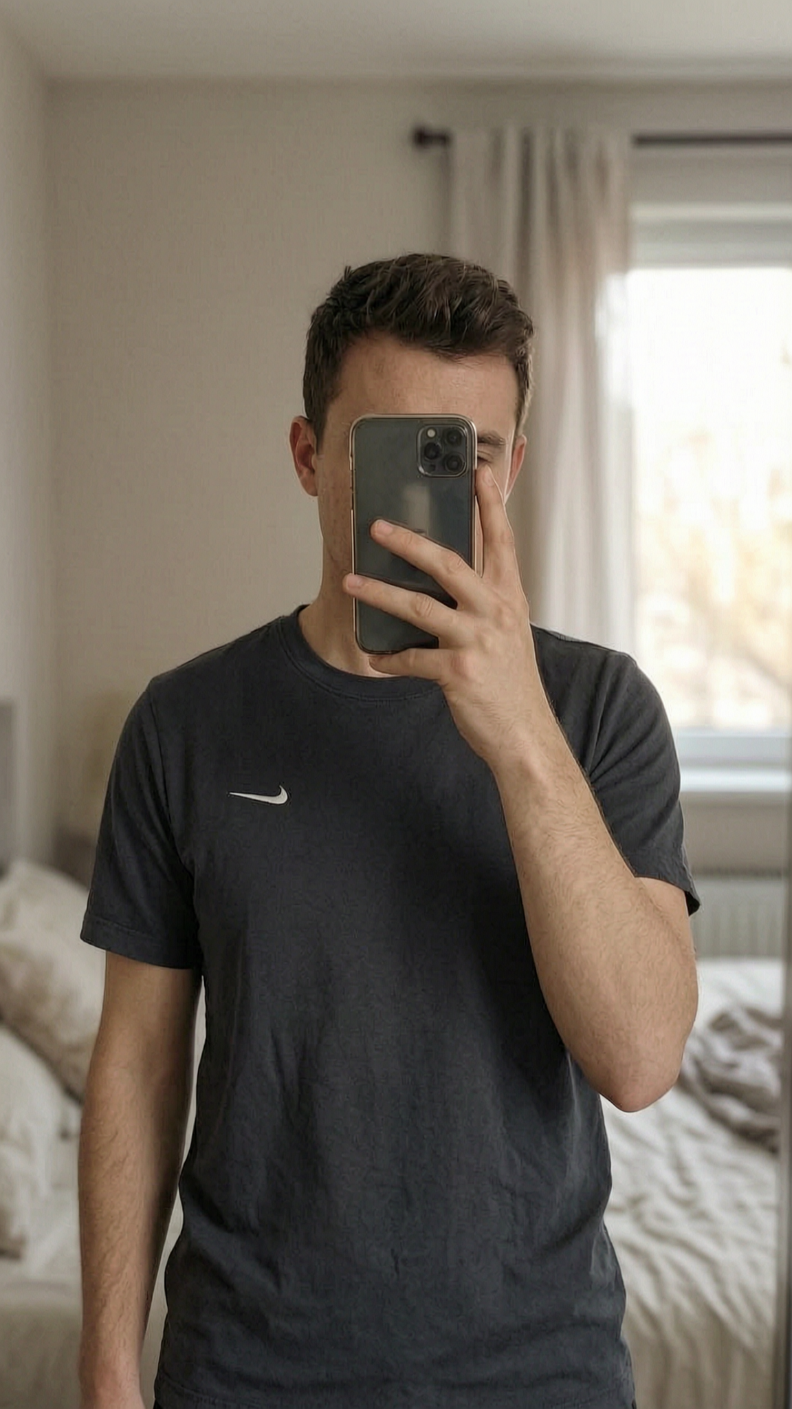 T-shirt Nike | Taille S | Noir debout, face à la caméra, dans une chambre à la lumière douce, avec une lumière naturelle filtrant par la fenêtre.