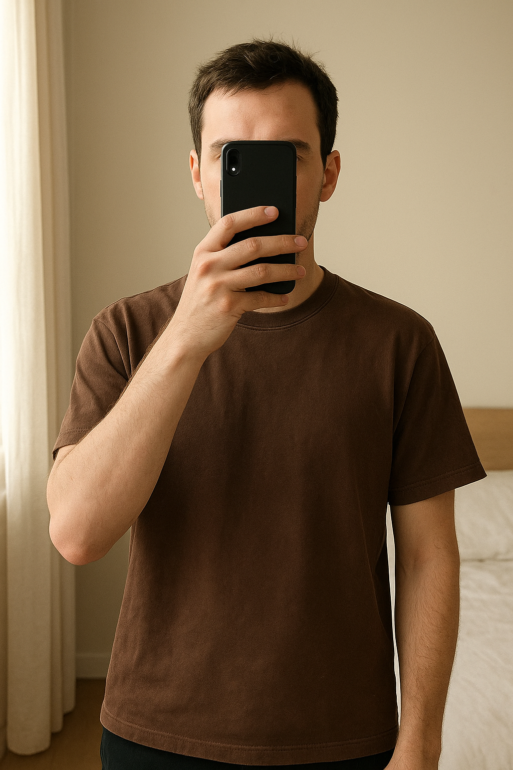T-shirt épais debout, face à la caméra, dans une chambre à la lumière douce, avec une lumière naturelle filtrant par la fenêtre.